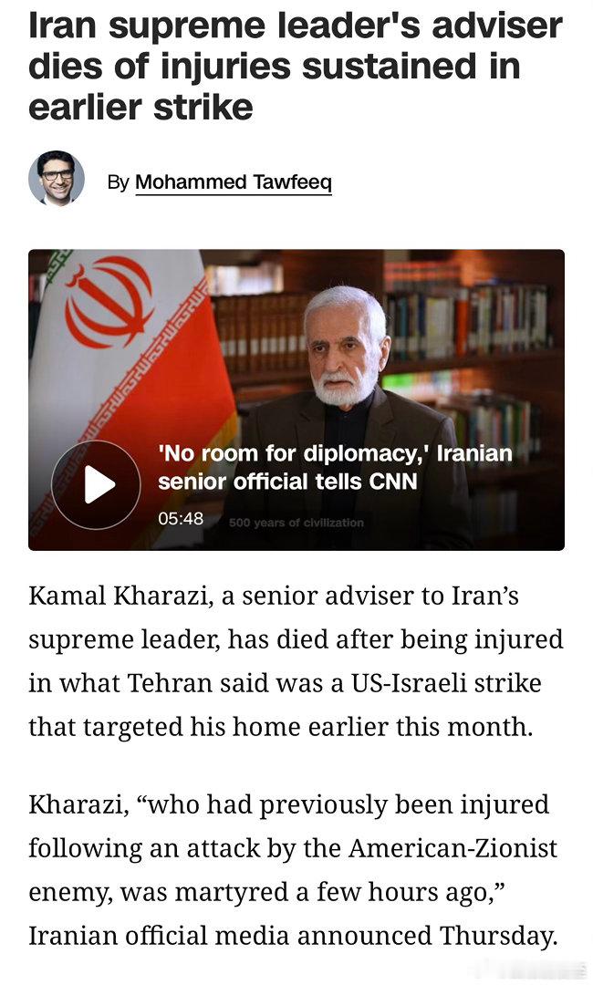 伊朗最高领袖的高级顾问,月初在空袭中受伤,今天官宣“不治身亡”三月刚接受CNN采