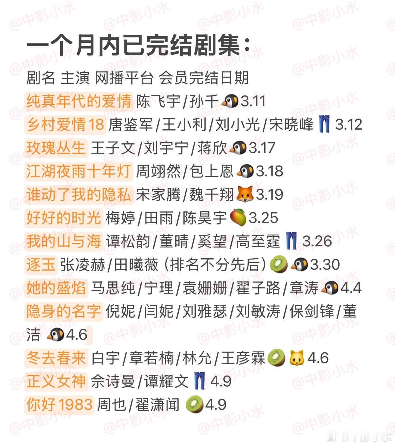 🈶白日提灯 迪丽热巴/陈飞宇🈶叵测 刘烨/聂远/王佳佳🈶月鳞绮纪 鞠婧祎/曾舜晞/陈都灵/田嘉瑞(排名不分先后)🈶钢铁森林 井柏然/蔡文静🈶冰湖重生 李昀锐/黄杨钿甜