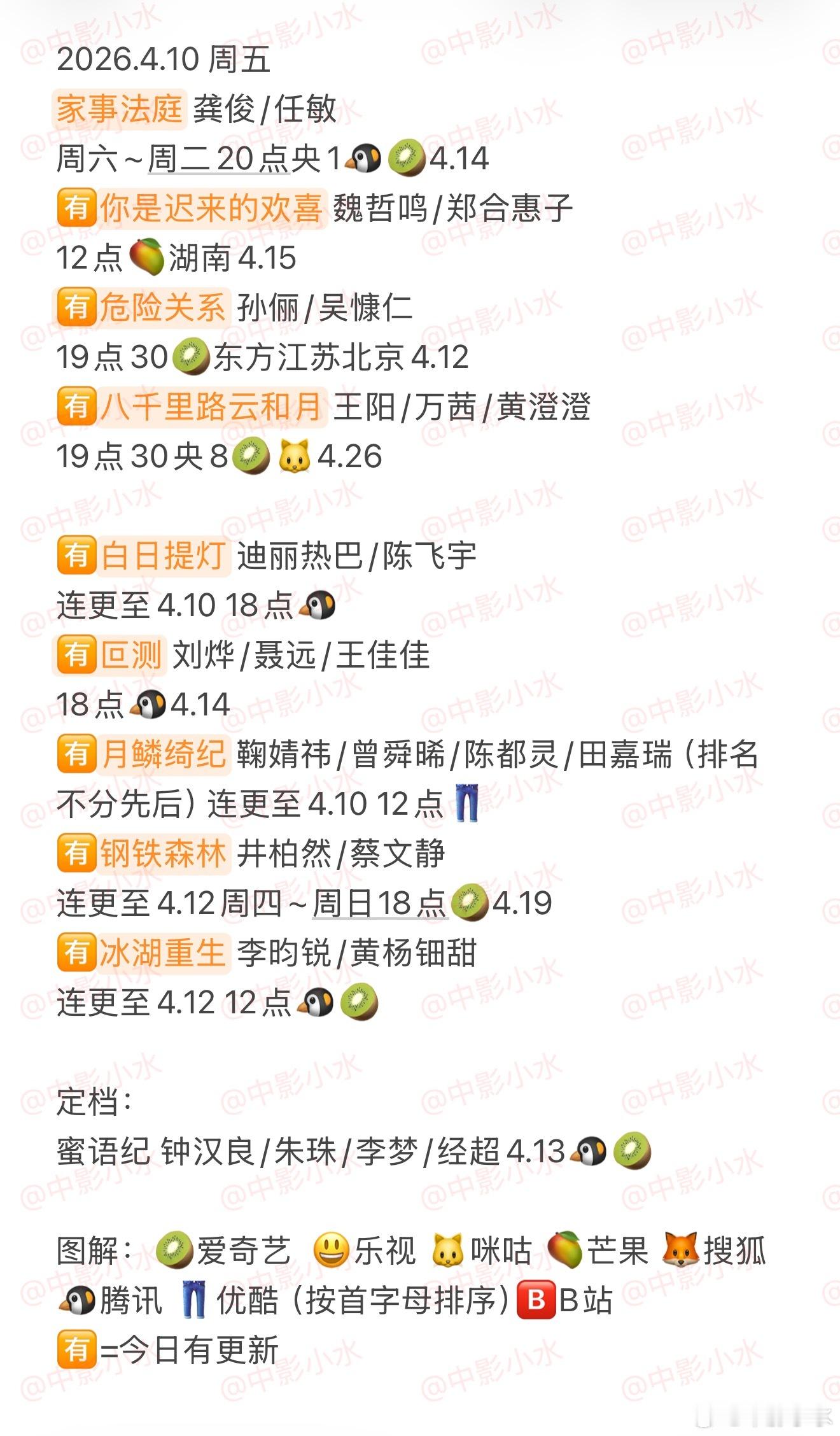 拯救剧荒 4月10日,今晚看点啥??图1 追剧日历 图2 综艺日历 图3 已完结剧集 🈶你是迟来的欢喜 魏哲鸣/郑合惠子🈶危险关系 孙俪/吴慷仁🈶八千里路云和月 王阳/万茜/黄澄澄