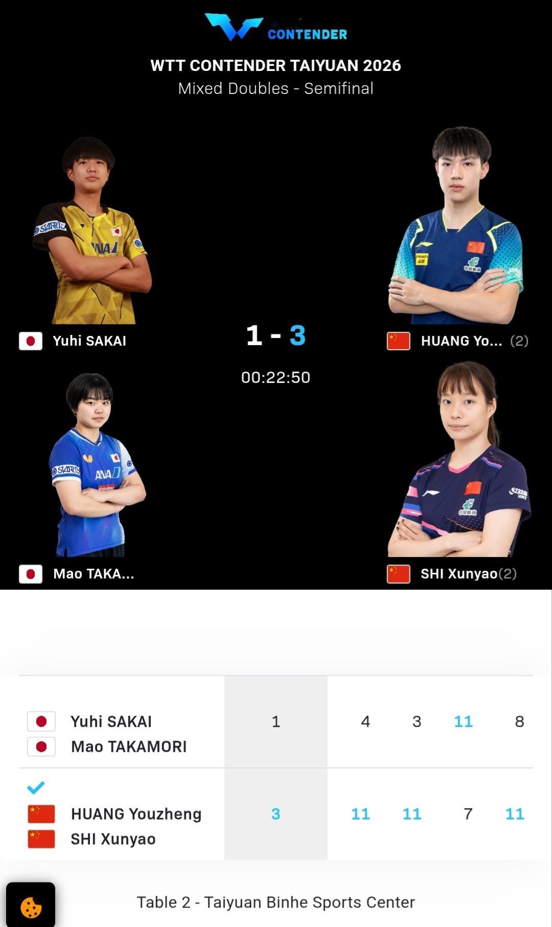 🔎混合双打方面⏰北京时间10:30💡球台:T1🏷混合双打1/4决赛🆚黄友政/石洵瑶🇨🇳3-2姚钧涛/吴咏琳🇭🇰11-5 8-11 6-11 11-9 11-8顺利晋级 进行⬇️⏰北京时间18:45💡球台:T2🏷混合双打半决赛🆚黄友政/石洵瑶🇨🇳3-1坂井雄飞/高森爱央🇯🇵11-4 11-3 7-11 11-8