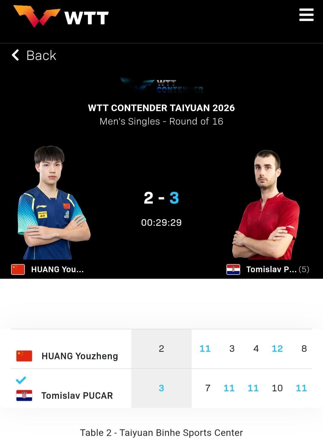 🔎男子单打方面⏰北京时间12:15💡球台:T2🏷男子单打1/8决赛🆚黄友政🇨🇳2-3托米斯拉夫·普卡🇭🇷11-7 3-11 4-11 12-10 8-11