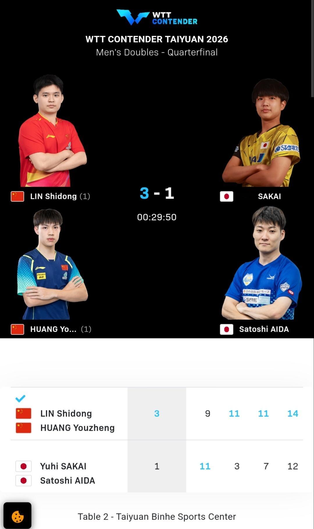 🔎男子双打方面⏰北京时间14:00💡球台:T2🏷男子双打1/4决赛🆚林诗栋/黄友政🇨🇳3-1英田理志/坂井雄飞🇯🇵9-11 11-3 11-7 14-12