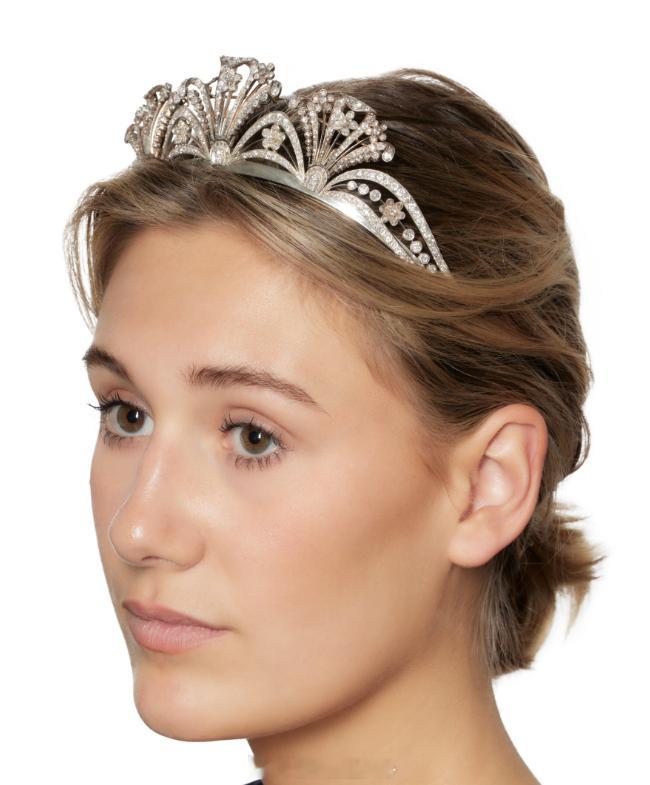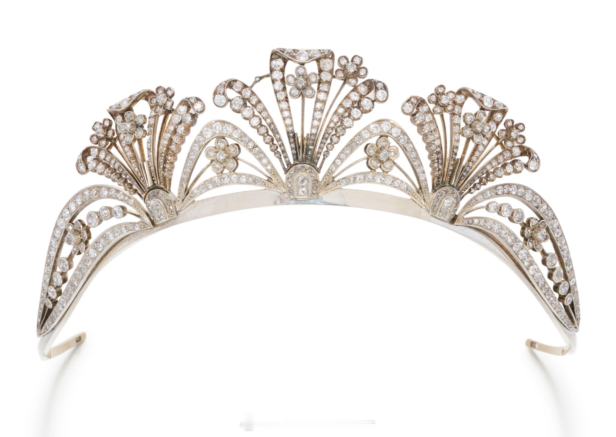 珠宝 约制作于上世纪早期的钻石王冠,由三枚放射状的羽毛胸针组成,羽毛饰以花卉图案和刀线装饰。它唯一有名有姓的主人是德国施瓦岑贝格族长约翰的老婆特蕾莎,佩戴照出现在1907年,羽毛部件的布局略有差。特蕾莎据说有8个孩子,继承王冠的人不明。2023年苏富比估价1-1.5w欧,3w成交,这价格挺划算
