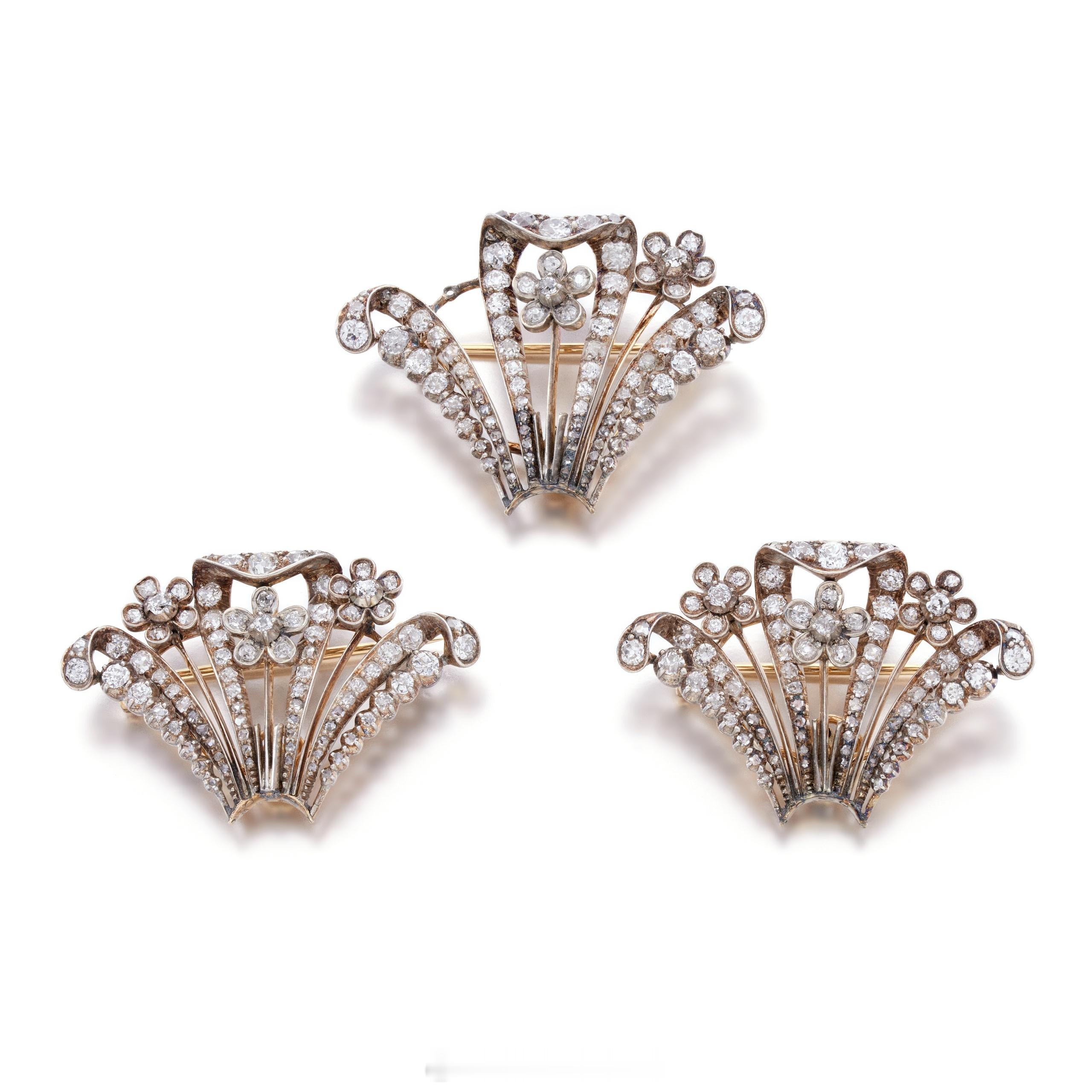 珠宝 约制作于上世纪早期的钻石王冠,由三枚放射状的羽毛胸针组成,羽毛饰以花卉图案