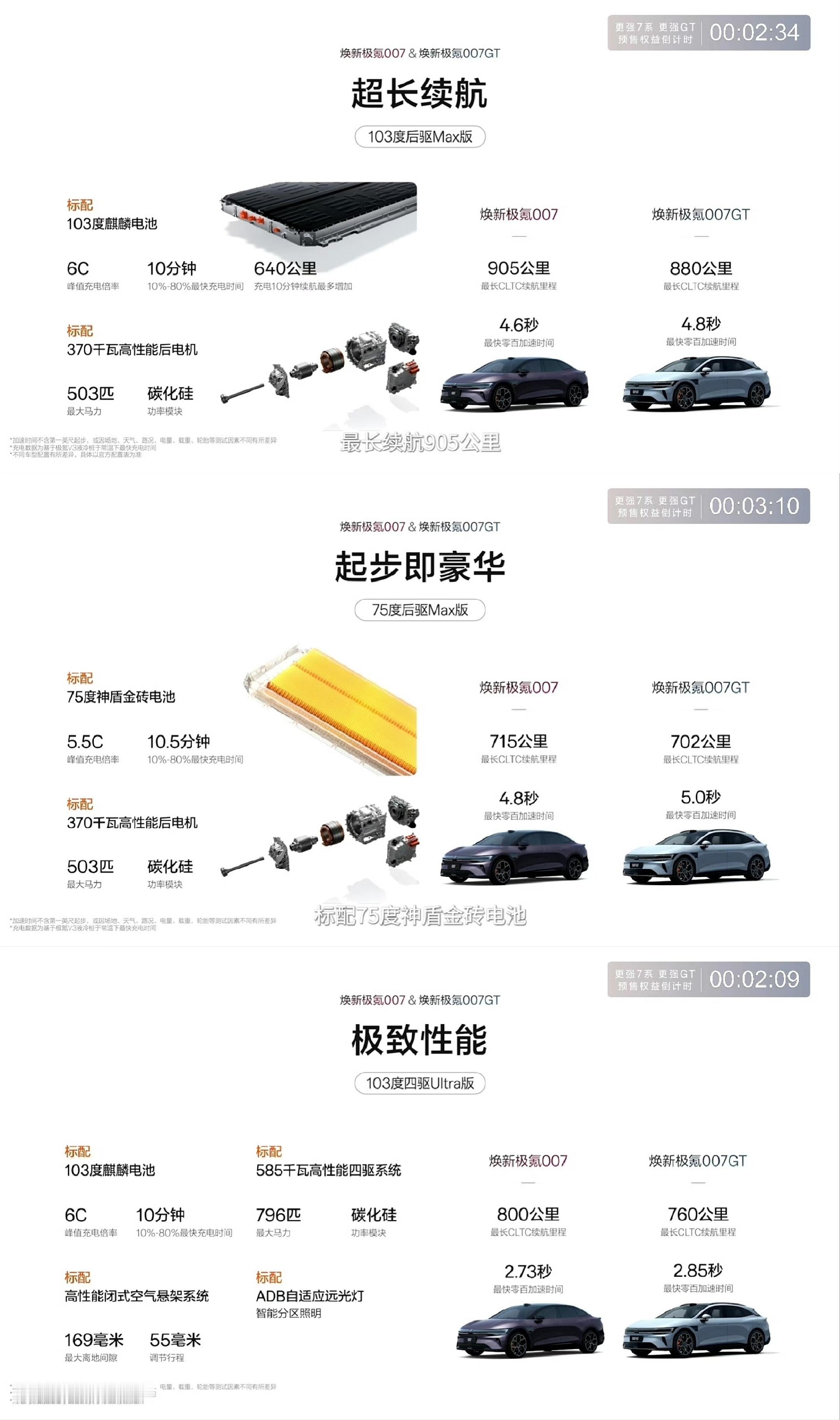 动力方面,车型提供后驱与四驱两种动力版本,满足不同用户的出行需求,日常城市通勤,75度后驱版性价比拉满,动力输出平顺线性,性能完全能够满足日常代步、通勤出行,兼顾能耗与驾驶质感,是家庭用车与日常代步的优选。产品核心层面,焕新7系实现全方位进阶,全系升级至900V高压平台,覆盖整车架构、电驱、热管理与电池系统,彻底颠覆20万级纯电车型性能表现。焕新极氪007零百加速最快2.73秒,焕新极氪007GT四驱版零百加速最快2.85秒,双车性能均稳居同级领先地位,带来媲美超跑的加速体验。
