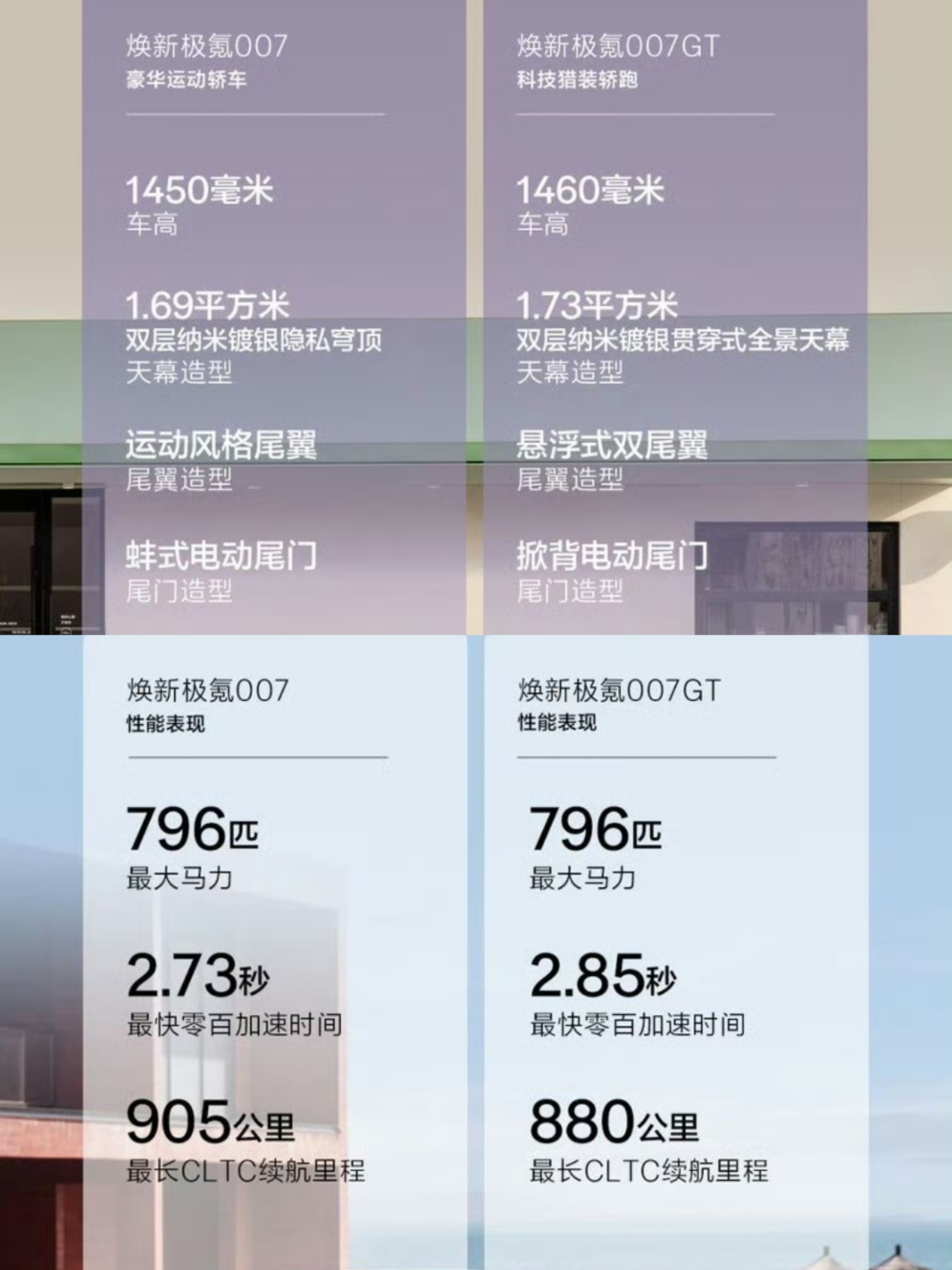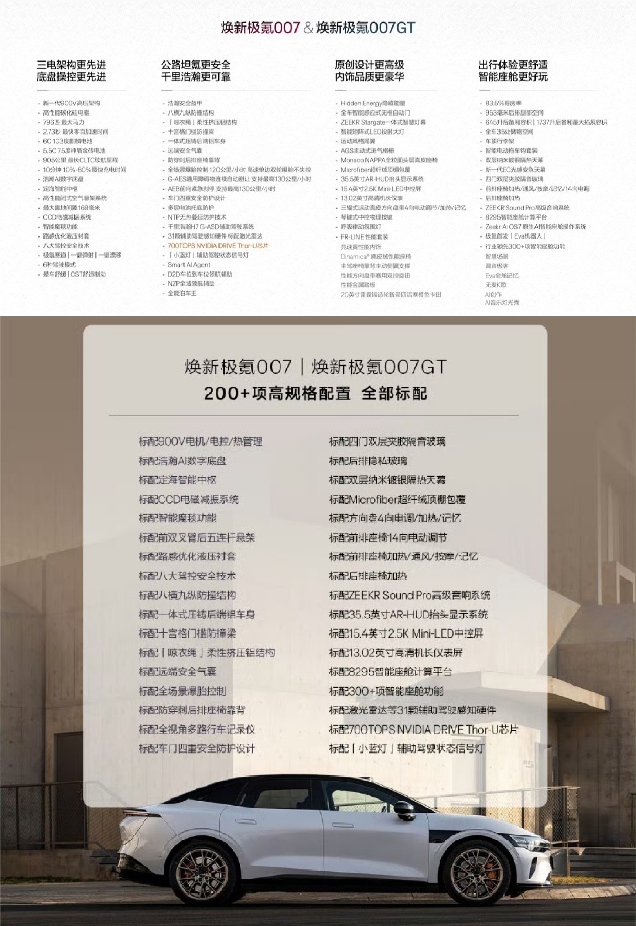 同时,焕新车型在车身结构、电池安全、极端工况防护上持续加码,新增远端气囊、高速爆胎稳定控制等配置与安全能力,全方位守护驾乘人员出行安全,用硬核技术重构纯电安全基准。针对不同用户喜好,两款车型各有亮点,适配多元用车场景。焕新极氪007兼顾颜值与实用,整体设计简约大气,内饰质感出众,适合追求均衡品质的家庭用户;而焕新极氪007GT作为科技猎装轿跑,堪称猎装爱好者的不二之选,驾驶乐趣拉满。