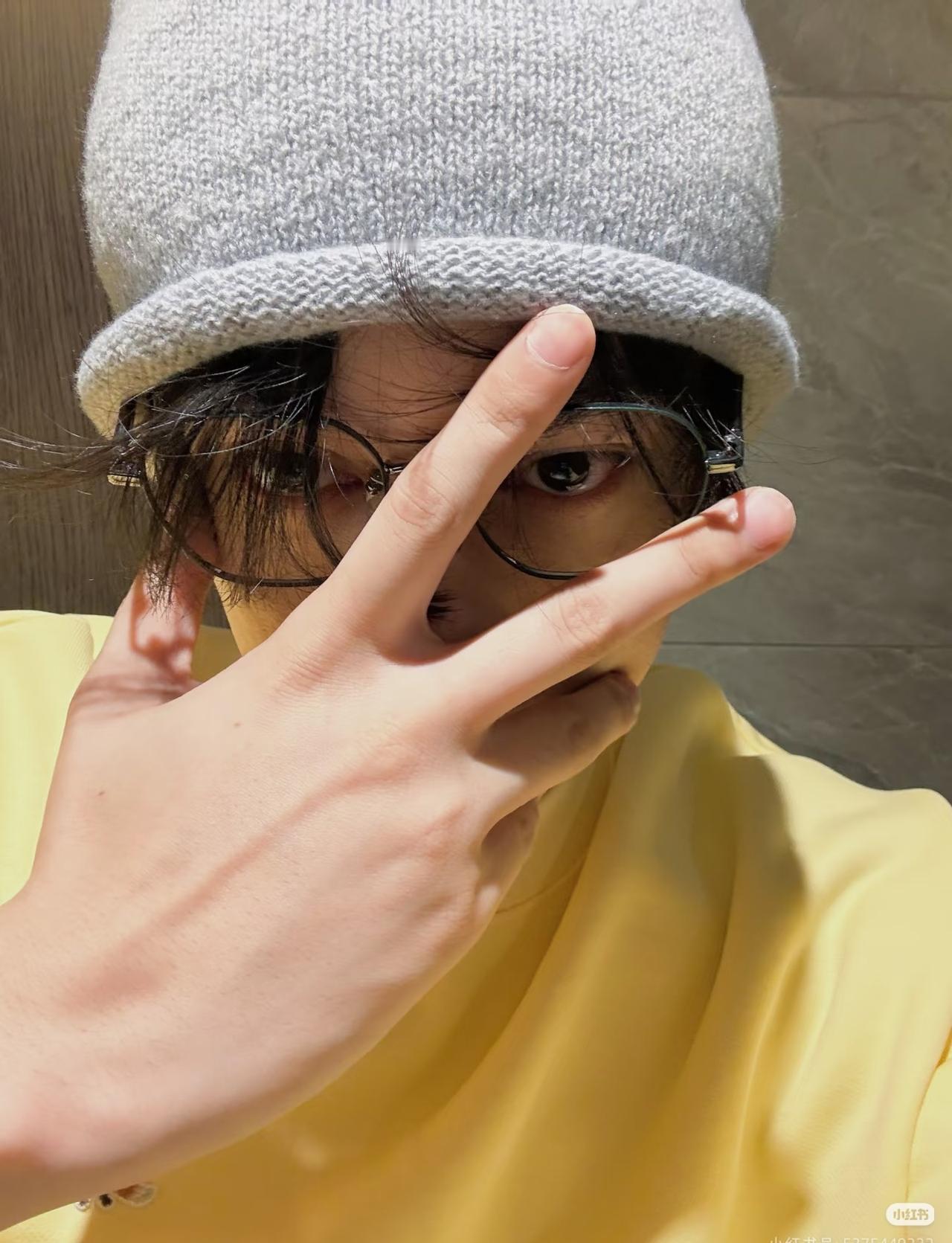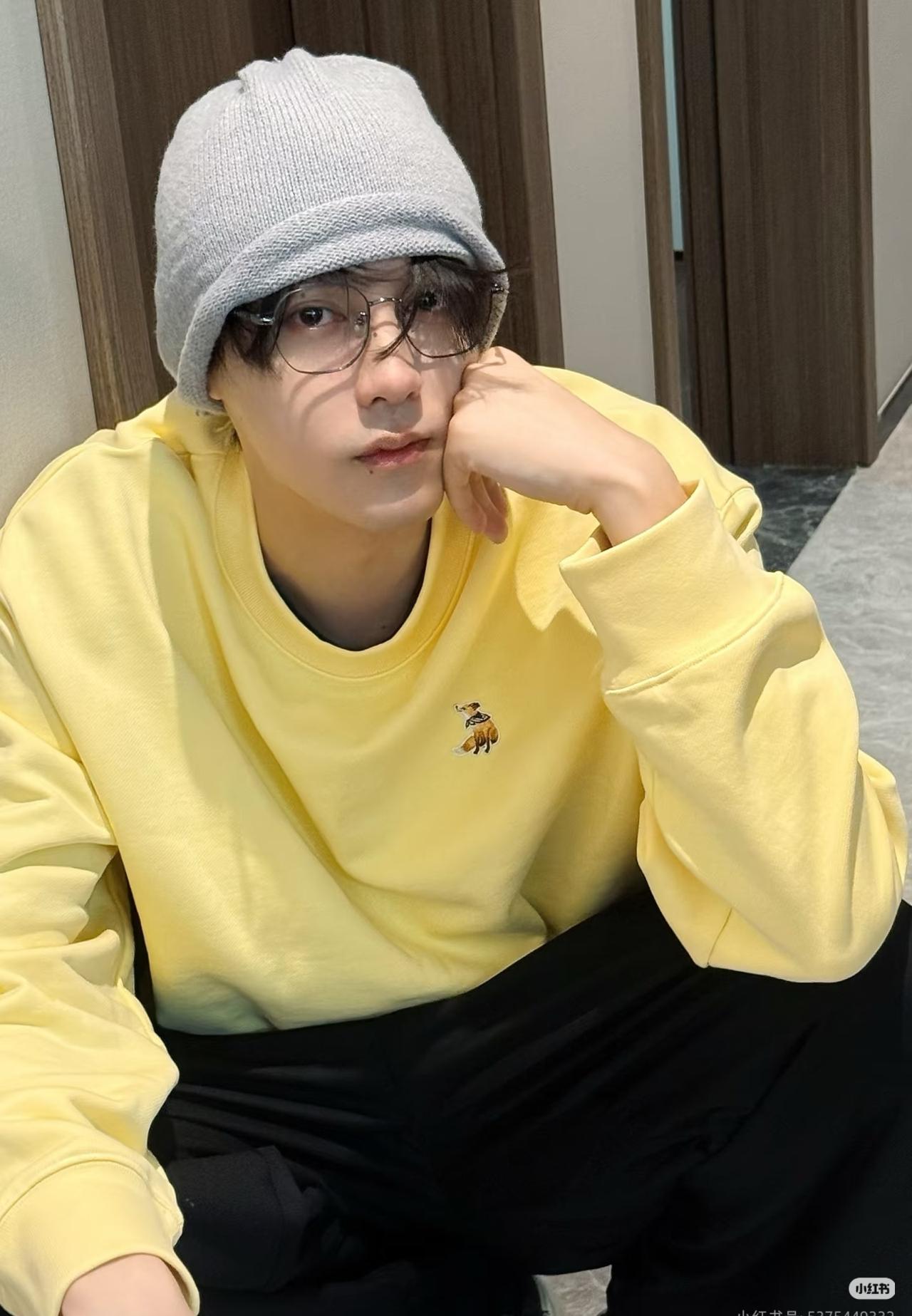 亮黄色连帽卫衣,配以冷帽、金丝边眼镜及微长发型,整体造型兼具潮流感与居家男友风,面部胡茬细节增添慵懒氛围。