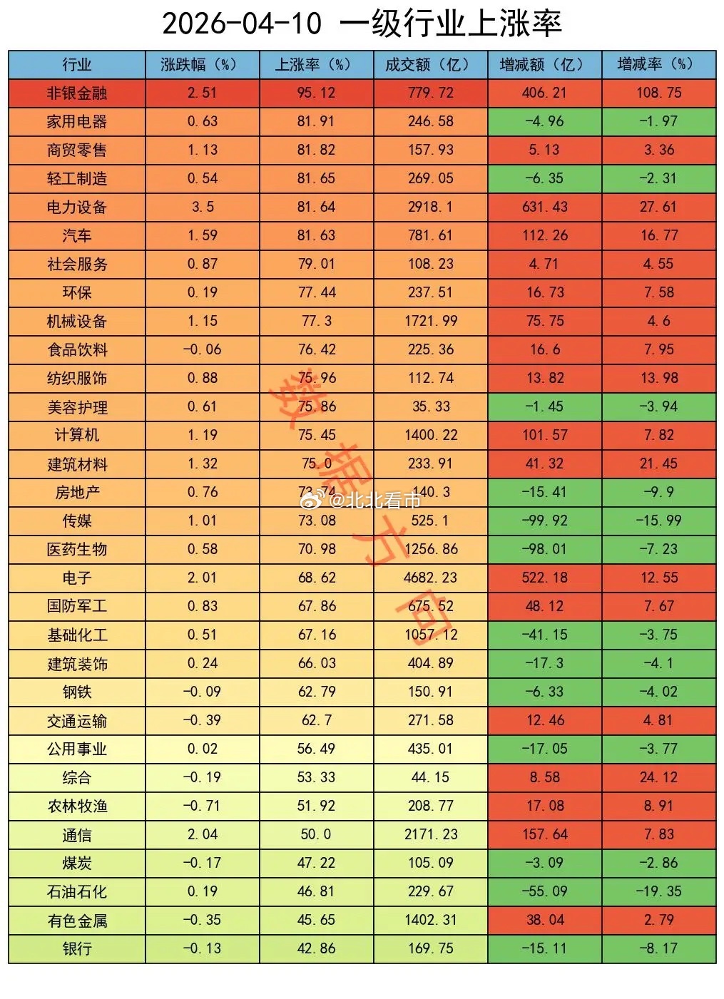 非银金融,涨幅2.51%,在所有行业中排第二,个股上涨率95%,在所有行业中排第一,大幅放量109%,在所有行业中断层领先
