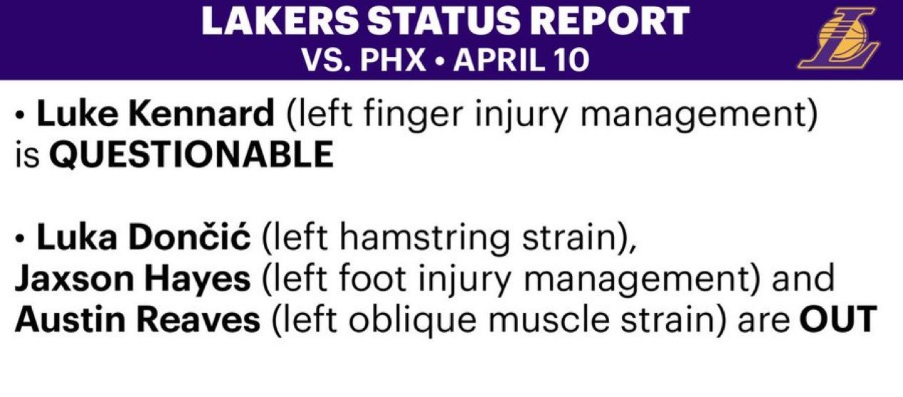詹姆斯也可以出战背靠背,肯纳德(左手指伤病管理)出战成疑,东契奇、里夫斯、海斯继续缺席太阳vs湖人