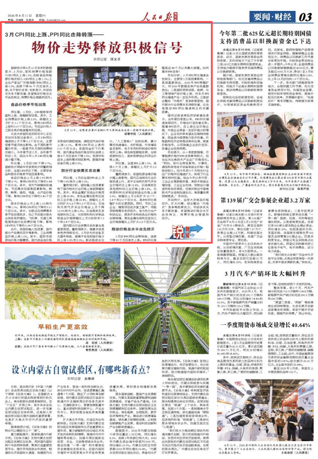 国家统计局4月10日发布的数据显示,3月份,居民消费价格指数(CPI)同比上涨1.0%,扣除食品和能源价格的核心CPI同比上涨1.1%;工业生产者出厂价格指数(PPI)同比上涨0.5%,连续下降41个月后首次上涨。关于物价走势,专家表示,市场供求关系不断改善,有望推动价格总水平由负转正、消费价格合理温和回升。
