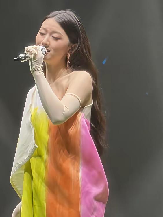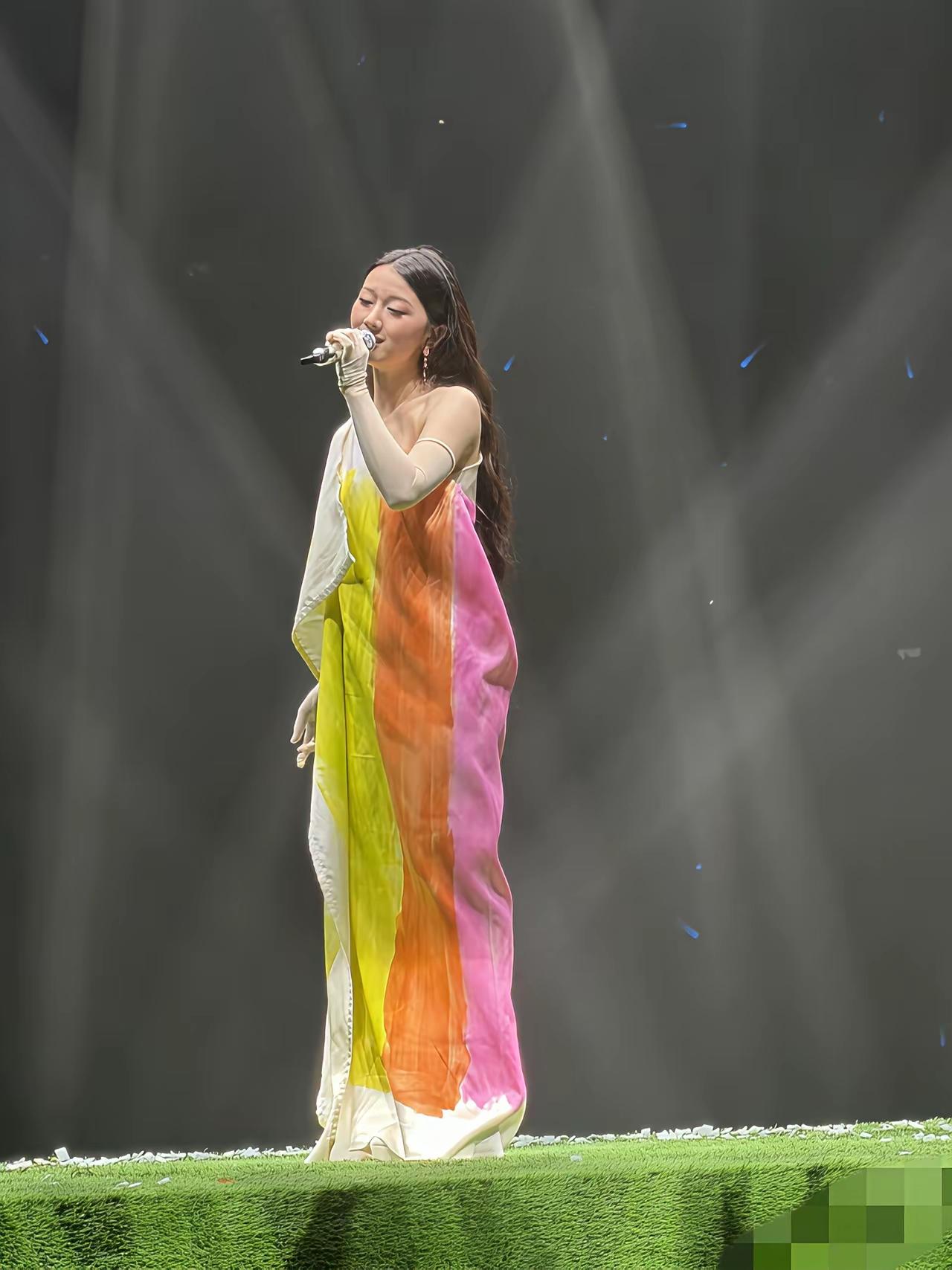 当天,单依纯身着一袭渐变色彩的抹胸长裙搭配长袖套,一头长发垂至腰间,整体造型显得飘逸、松弛又舒展。