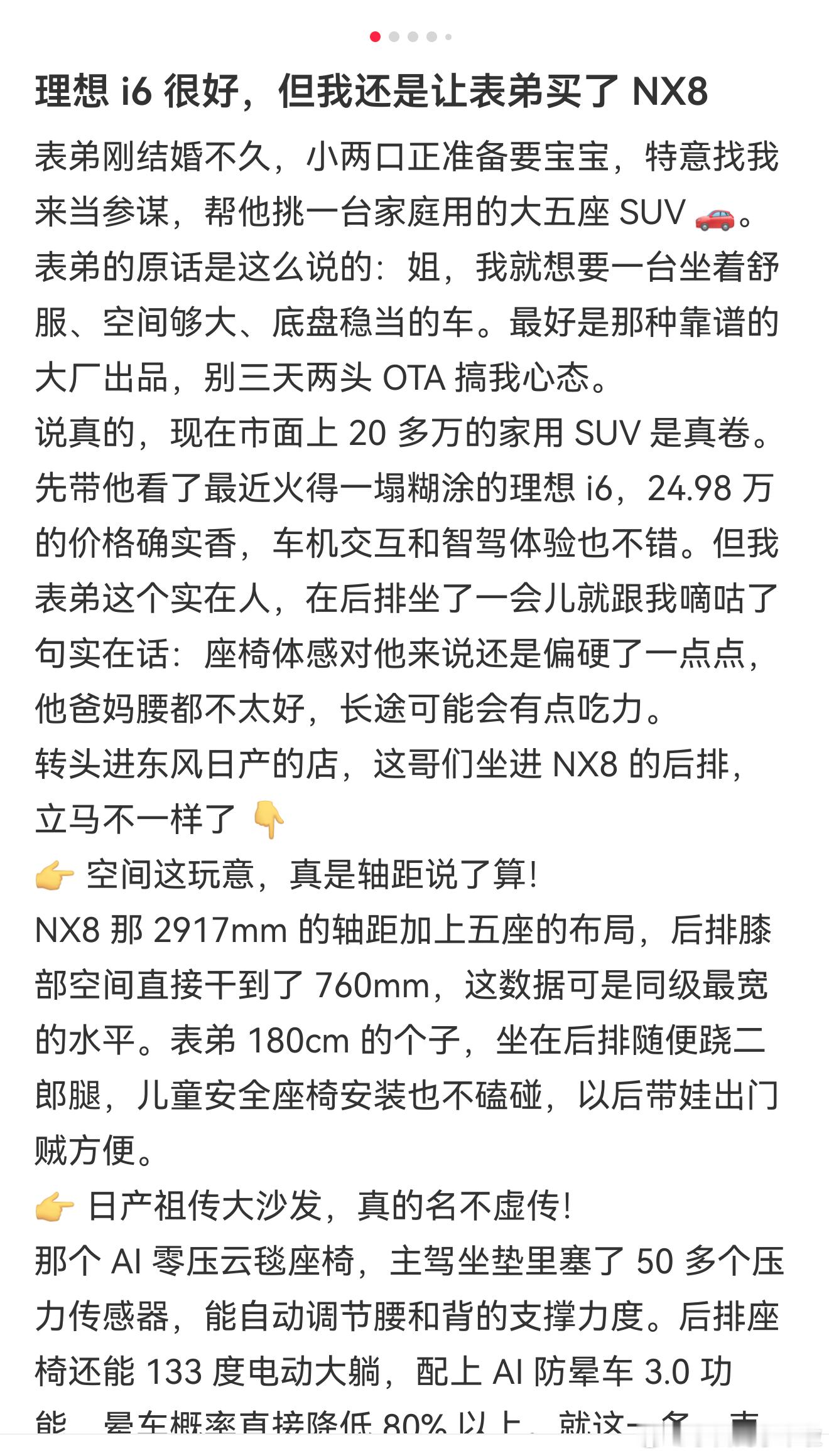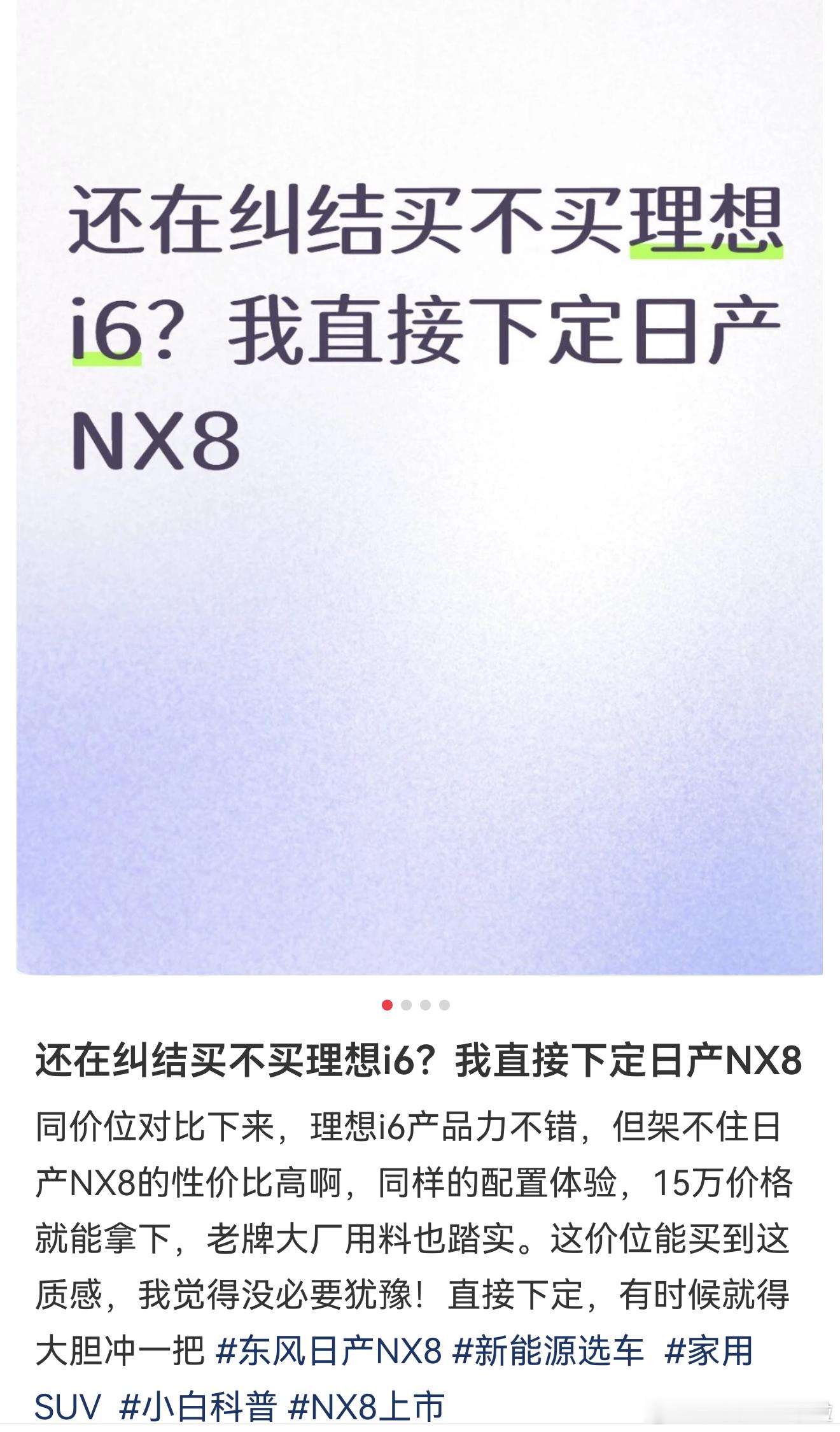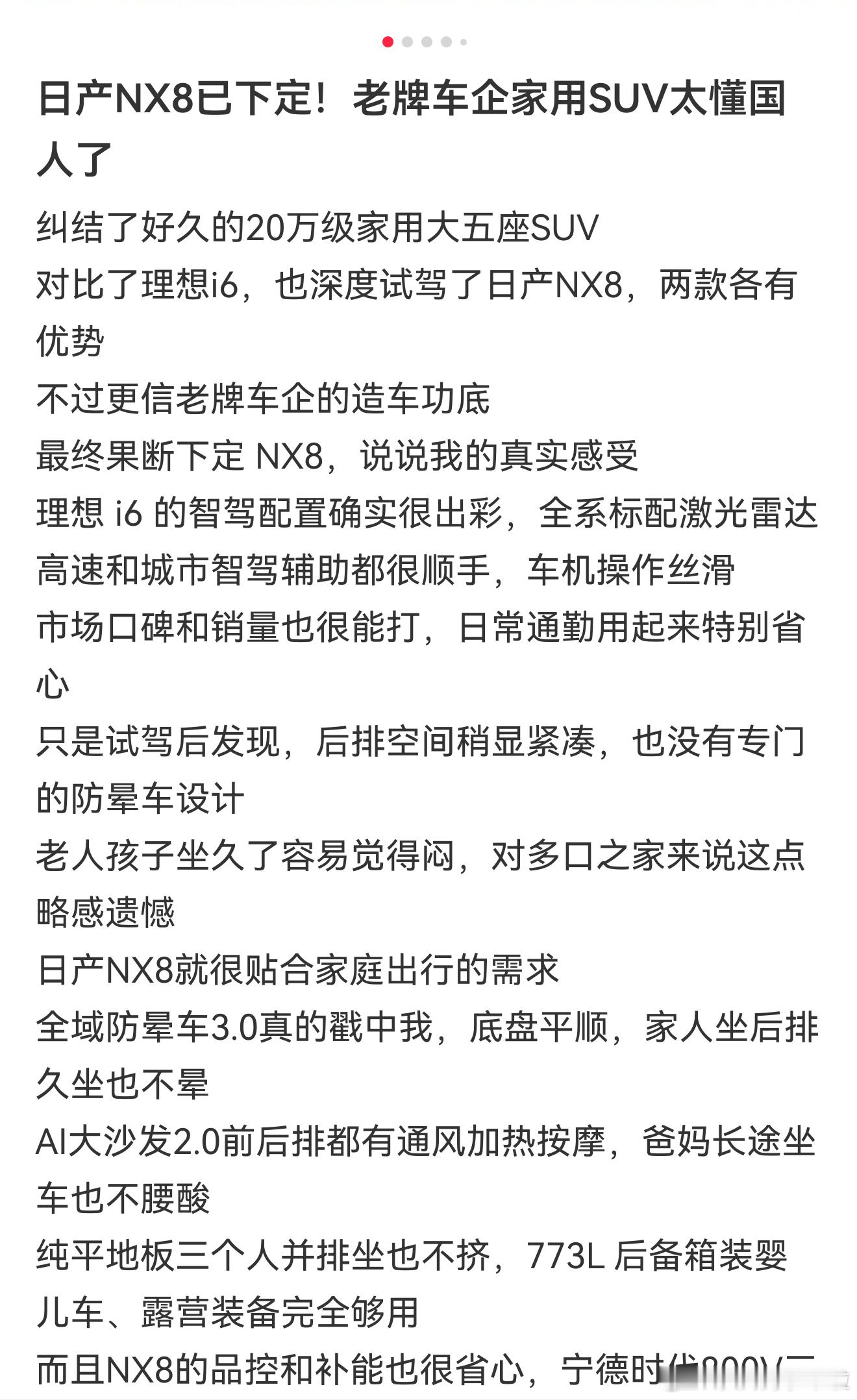 没想到这么多人在日产NX8 和理想 i6 中做纠结,而且最终好像都更倾向 NX8