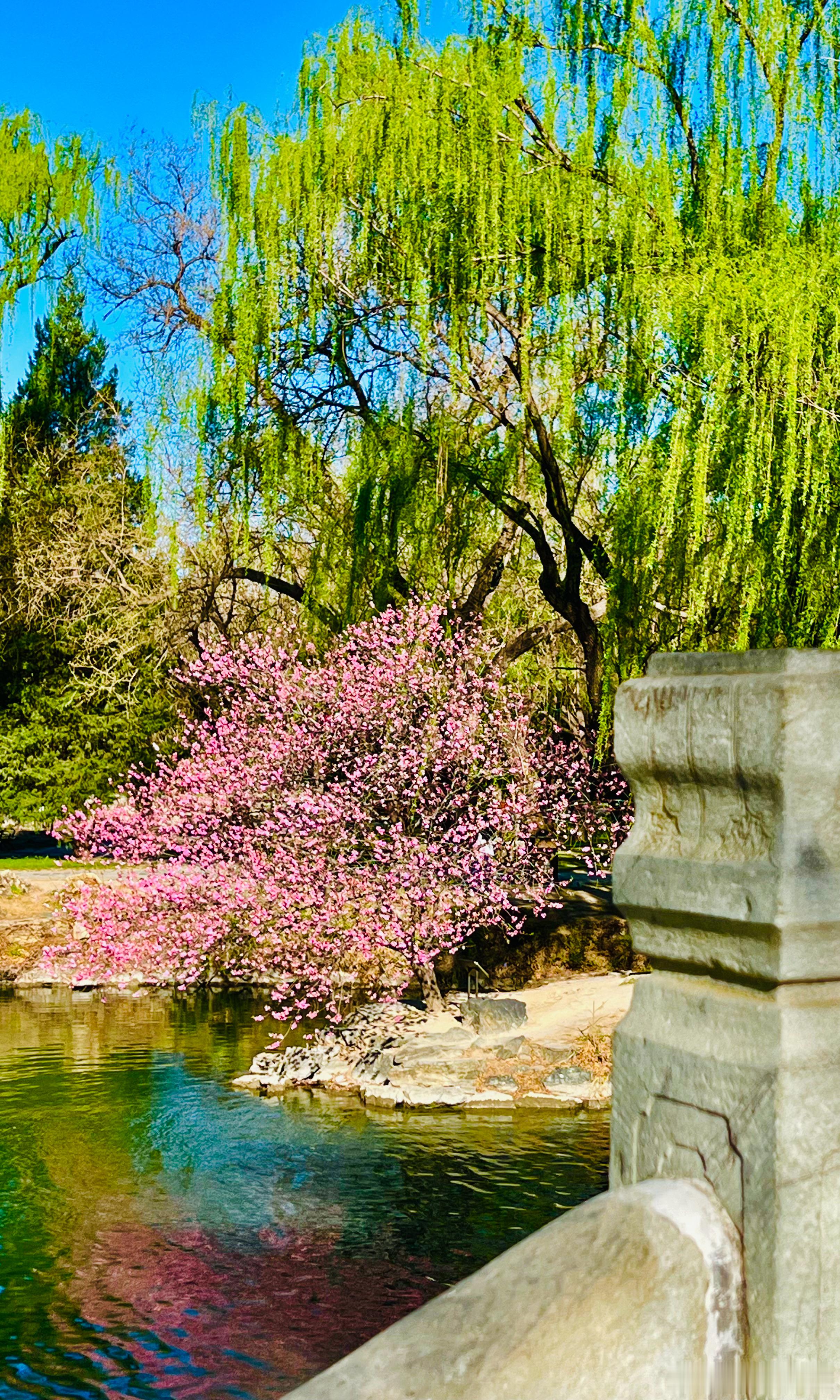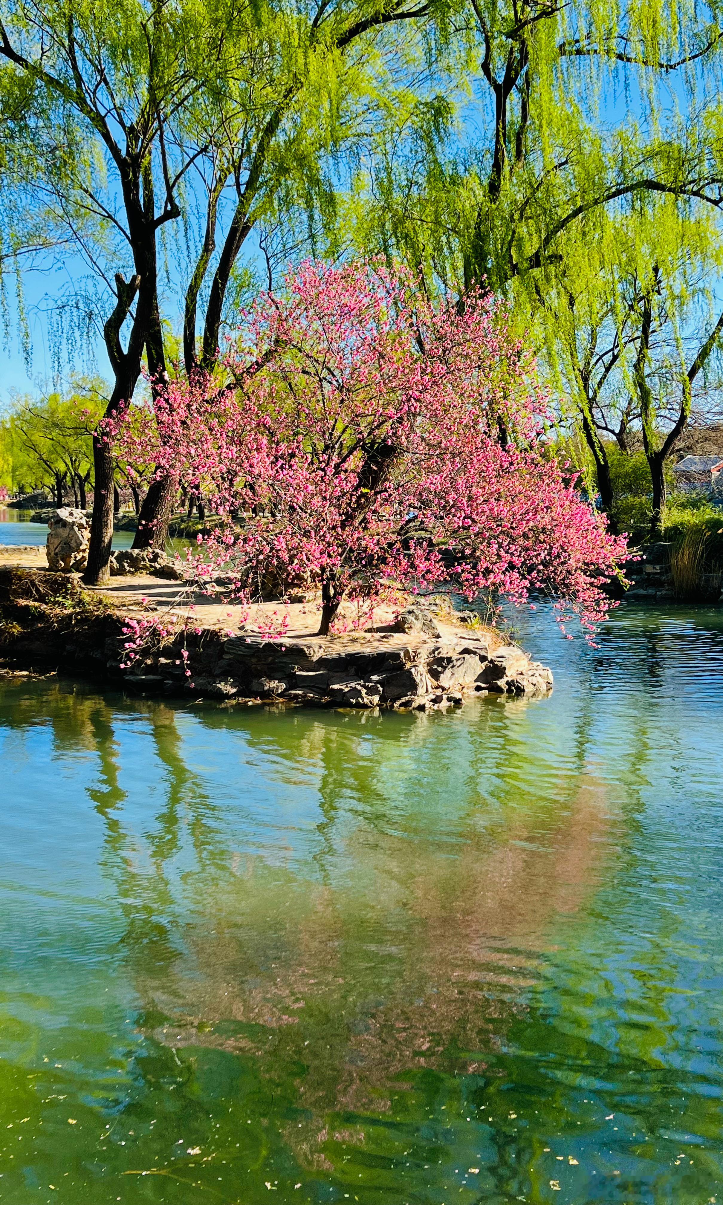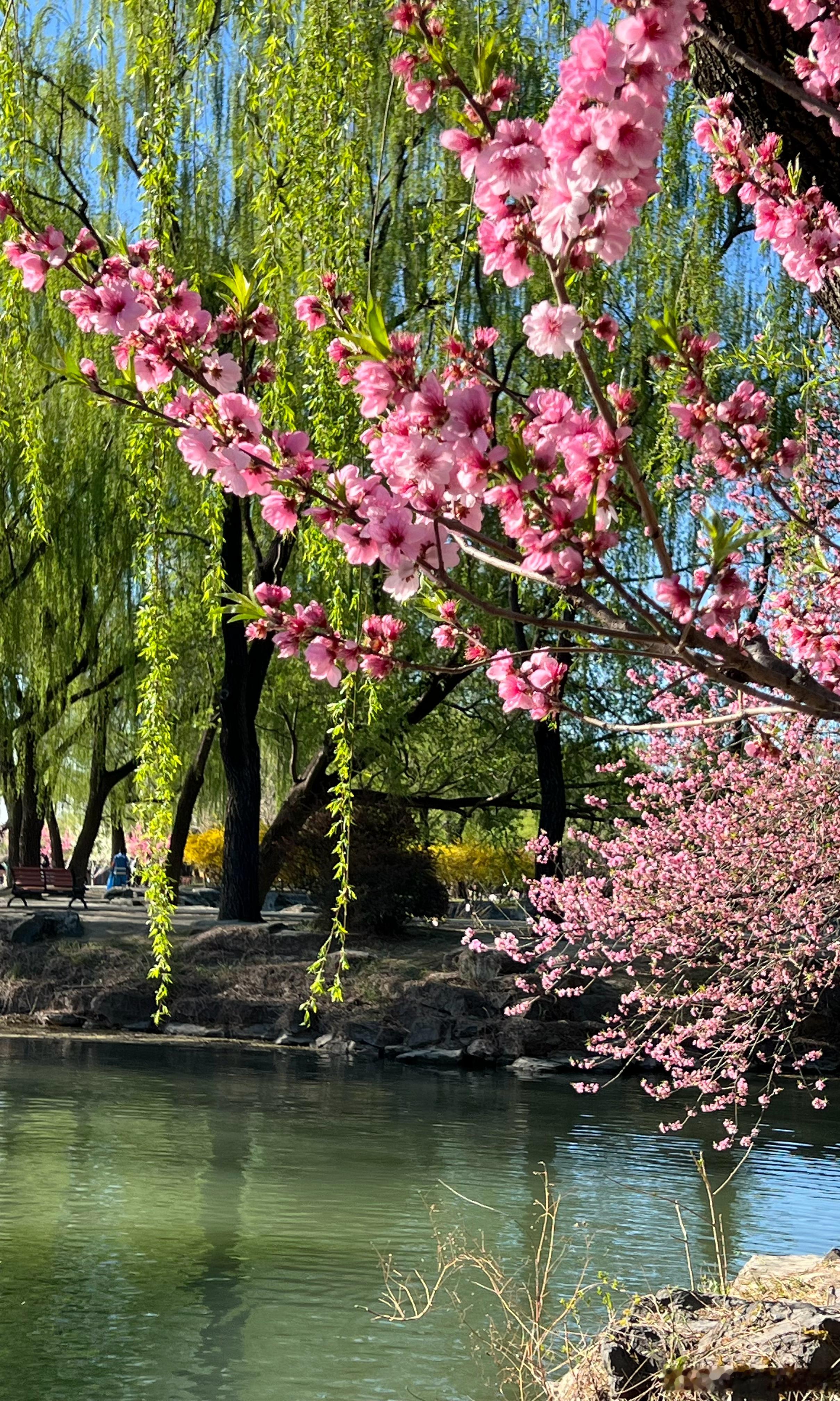 四月,真是一年中最美的时节。公园里,桃花、杏花、樱花竞相绽放,红的像火,粉的像