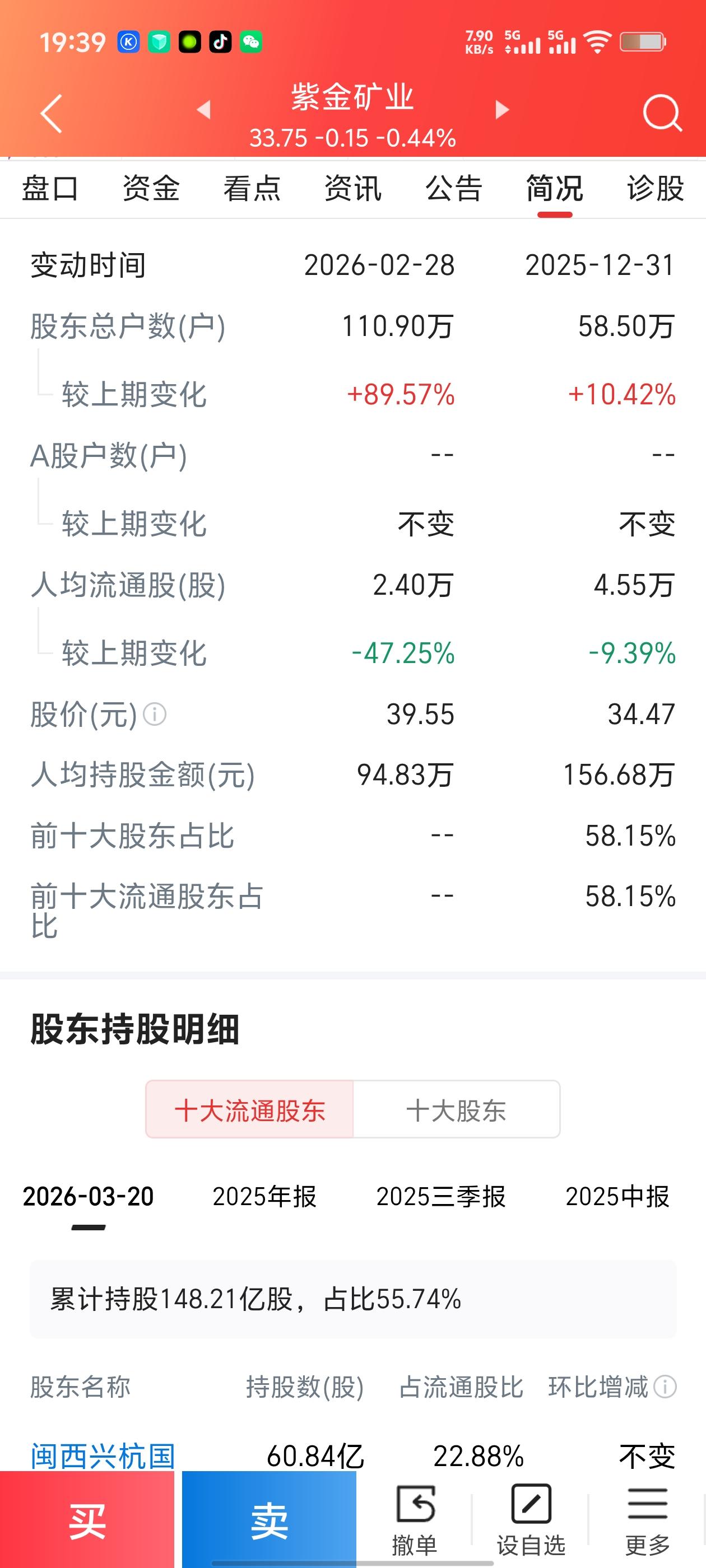 今日紫金矿业收报33.75元,微跌0.44%。