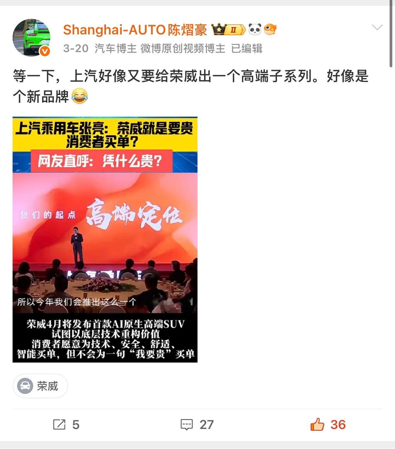 将会是荣威的全新序列。和互联网大厂火山引擎(豆包、今日头条、抖音)的合作。之前网传上汽和华为合作的「境」系列,据我了解应该也是不实消息