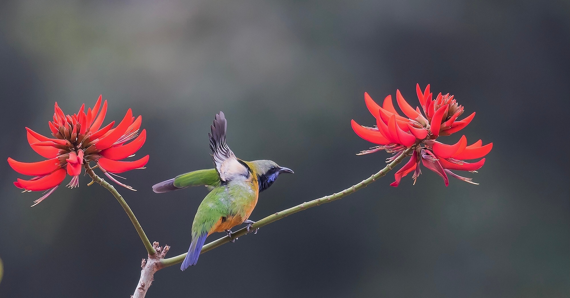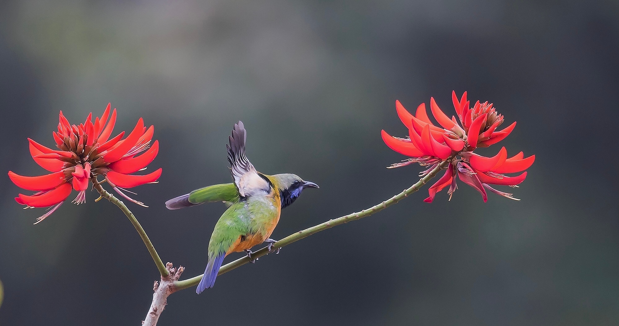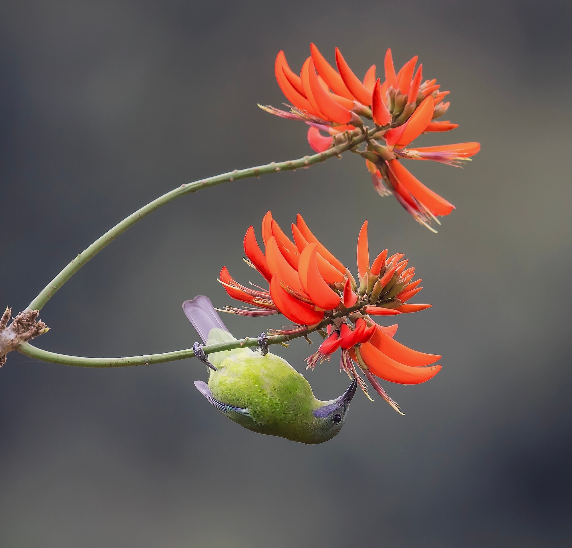 那天蹲到它,看它一会儿倒挂在刺桐花上吸花蜜,一会儿扑棱着翅膀整理羽毛,灵动得不行!