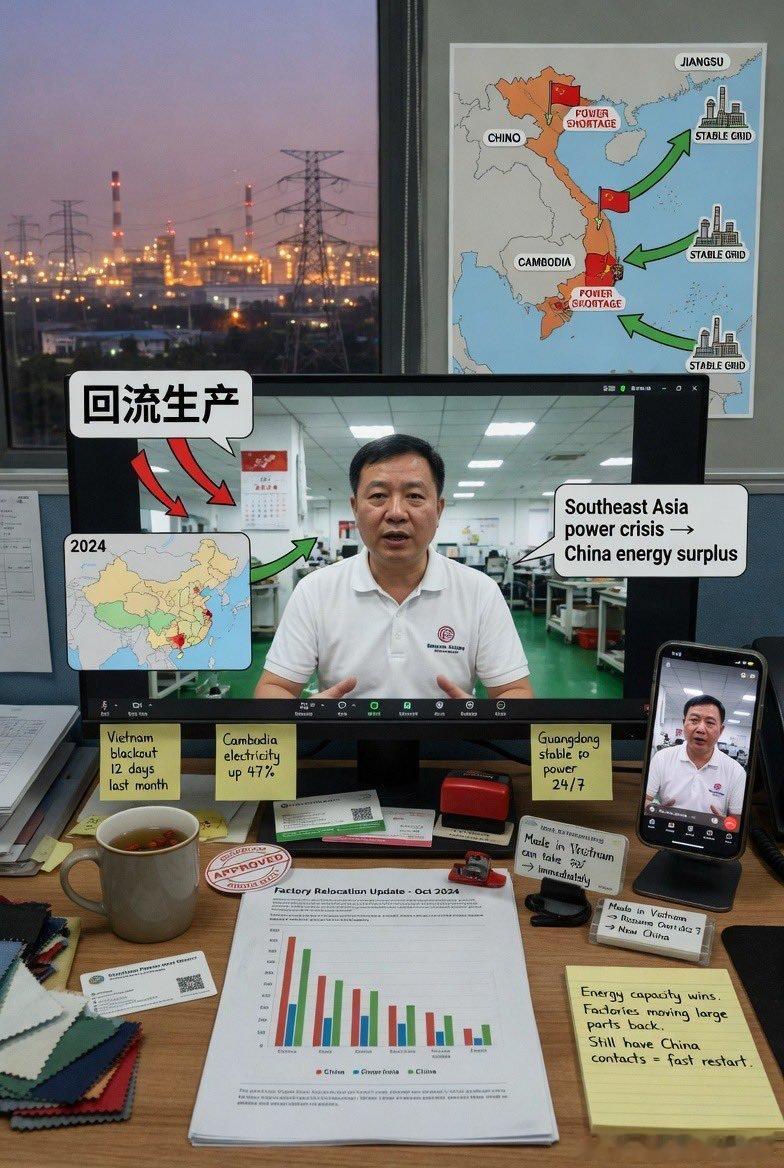 据说,近年来迁往东南亚的许多工厂,现在正在迅速把大量生产环节重新转移回中国。主要原因是中国具备足够的能源供给能力,可以保障工厂持续运转,而东南亚则正在面临电力短缺以及能源成本飙升的问题。