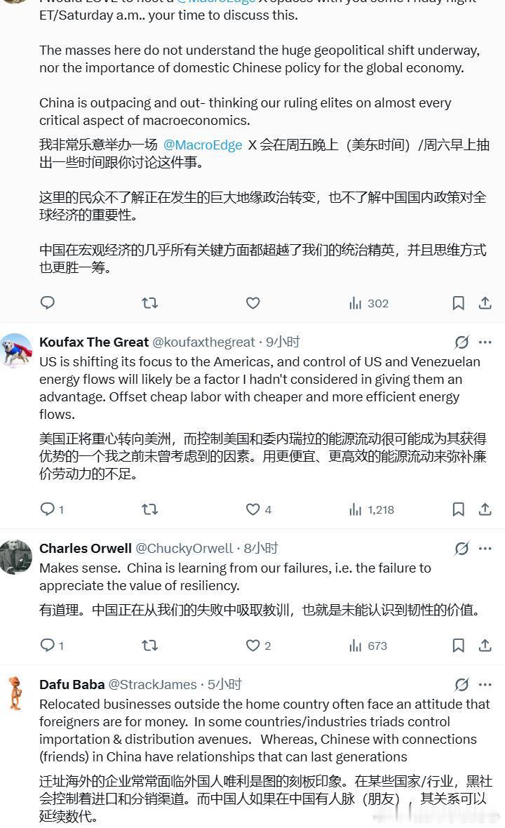 “随着世界陷入能源危机, 中国从俄罗斯和伊朗获取石油的渠道及其炼油能力将为中国在亚洲赢得新的盟友和影响力。特朗普在中东的战争将适得其反,对美帝国的损害是不可挽回的。”