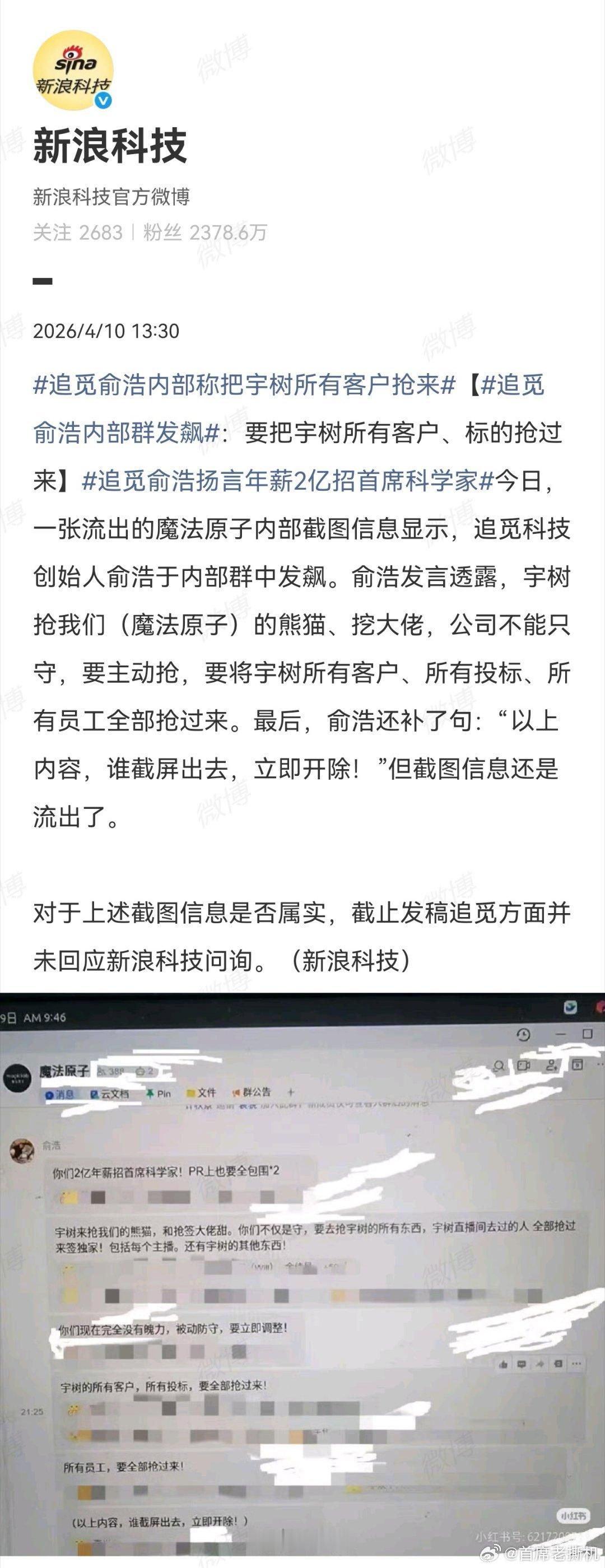 追觅俞浩内部称把宇树所有客户抢来 是不是很有意思,只要是内部狠话,且说了谁截图就开除,总能全网疯传!
