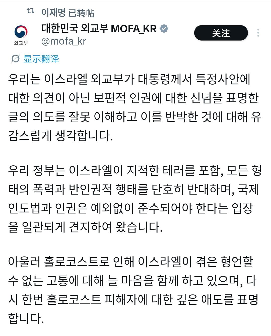 它用「反对一切形式的暴力与反人权行为」这个绝对正确的框架,把硬刚以色列的立场焊死在韩国的外交档案里。既同情以色列的伤痛,又绝不纵容其暴行,进可攻退可守,谁都挑不出毛病。