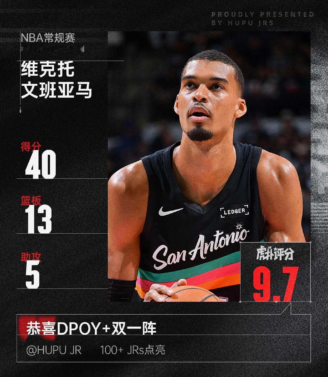 文班亚马全场出战26分钟,投篮23中14,三分7中2、罚球11中10得到40分13篮板5助攻1抢断2盖帽。