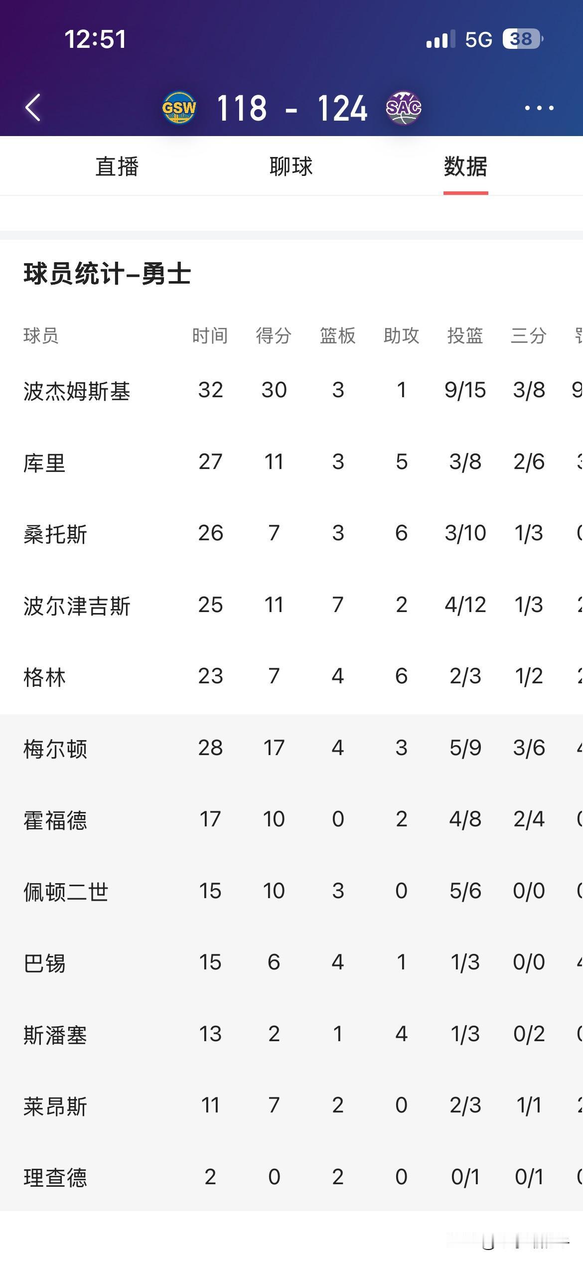 库里、波神、霍福德复出,勇士却败给国王,这剧情真让人摸不着头脑。之前库里复出打火箭,65天没打一上来就砍29分,三分8中4,可还是输了。那场比赛他只打25分钟,科尔掐得死死的。他带起过节奏,但后面明显状态受影响,失误也多,自己都说腿沉手跟不上。