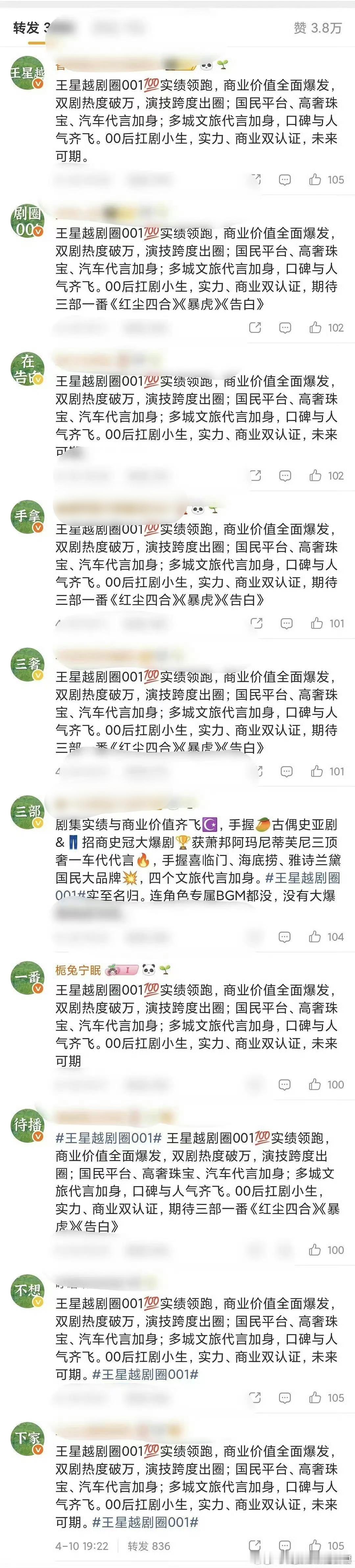 陈飞宇、王星越 粉丝在排字喊话中,“剧圈001” 这个花名两家都要定了陈飞宇艾米