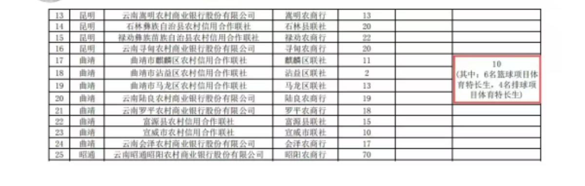 细看这份名单,涉及的单位绝非个别网点特立独行。安宁市农村信用合作联社、曲靖市麒麟区农村信用合作联社、曲靖市马龙区农村信用合作联社、玉溪市江川区农村信用合作联社,外加云南玉溪红塔农村商业银行,多家机构齐刷刷亮出了同样的高门槛。在篮球、排球、足球三大项目上具备较强专业能力与竞技水平,成为跨入这些网点的硬性通关文牒。