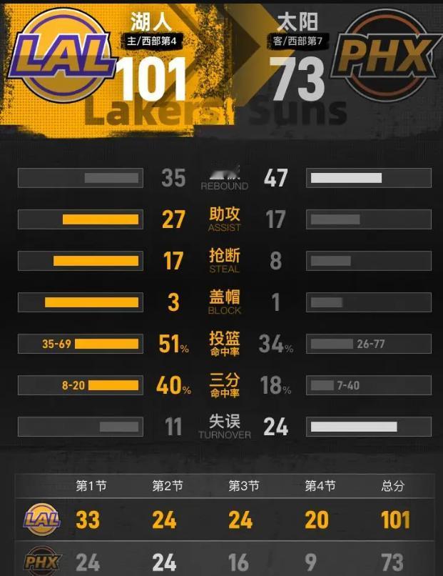 您说这101比73是养生球?我看是湖人队给太阳办了个"铁匠铺开业典礼"!