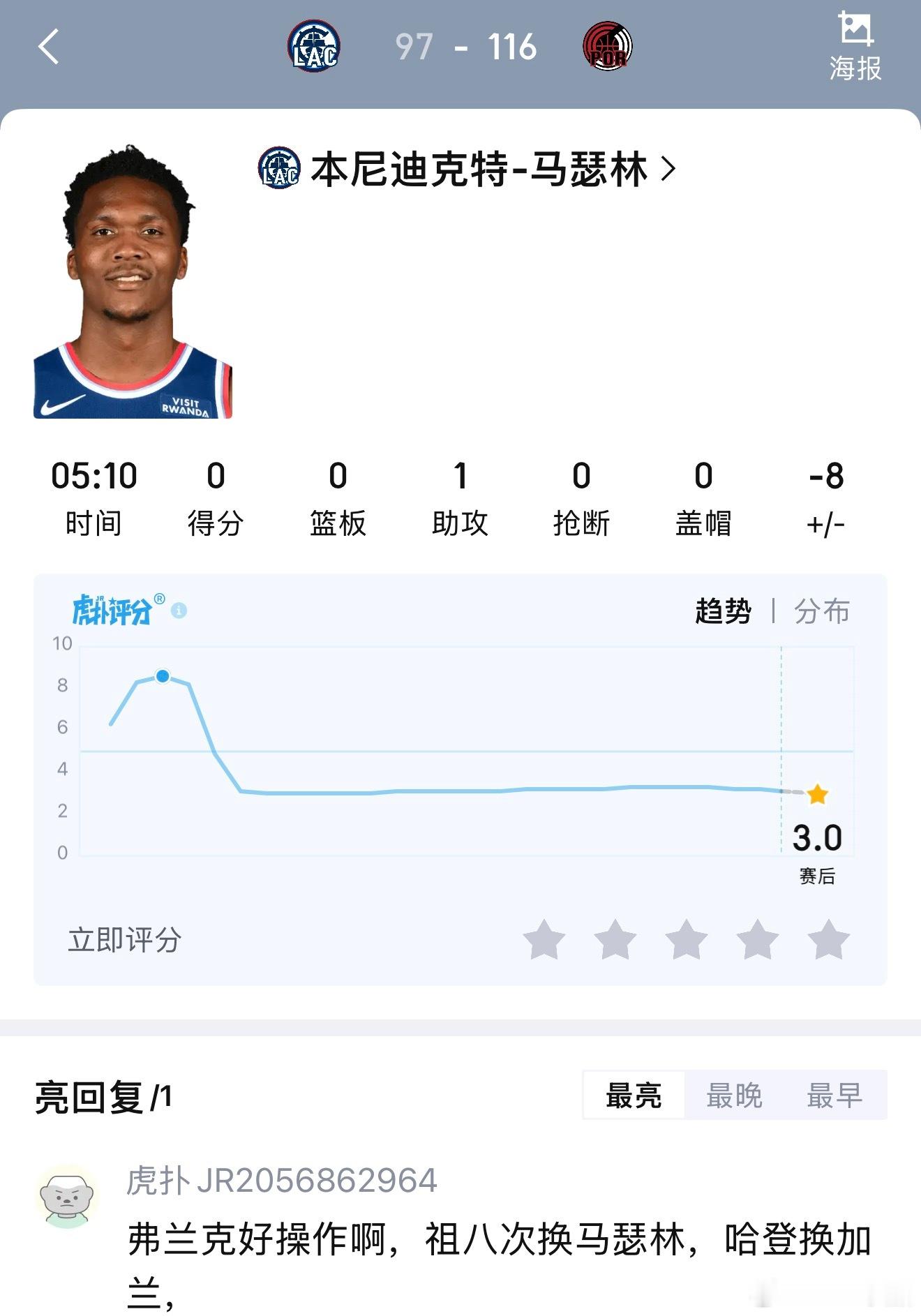 小卡的眼神要绝望了!柯林斯太坑了,马瑟林太坑了,加兰太坑了!快船输掉了最关键