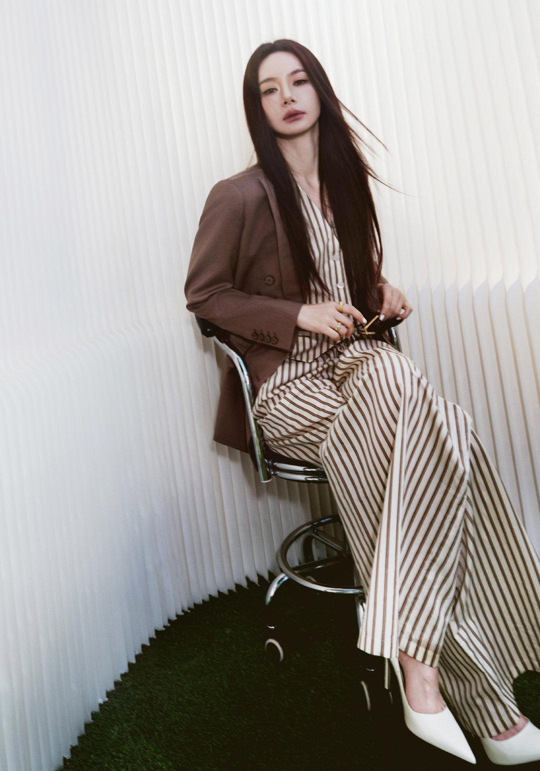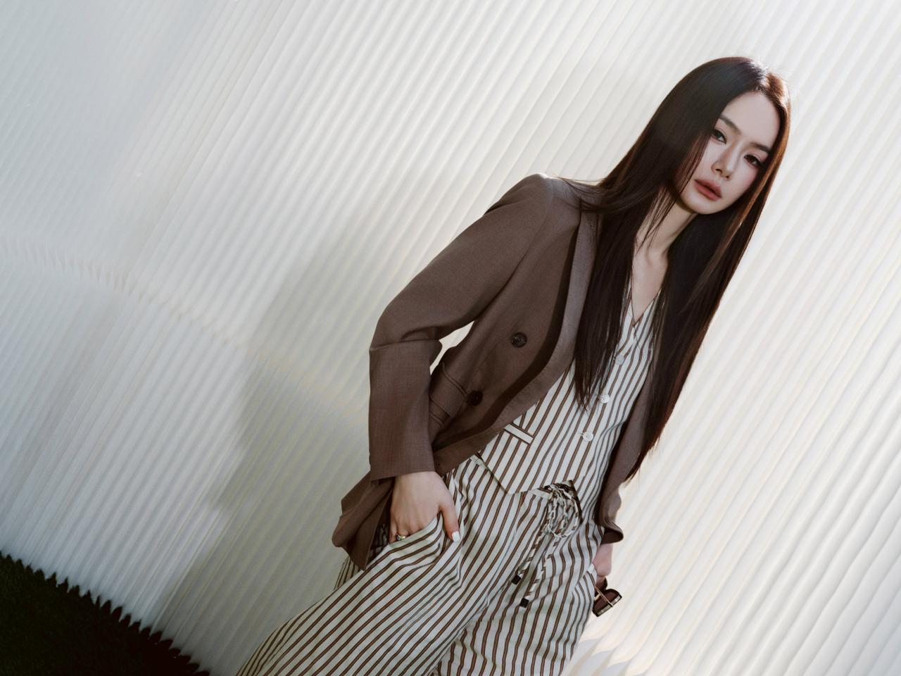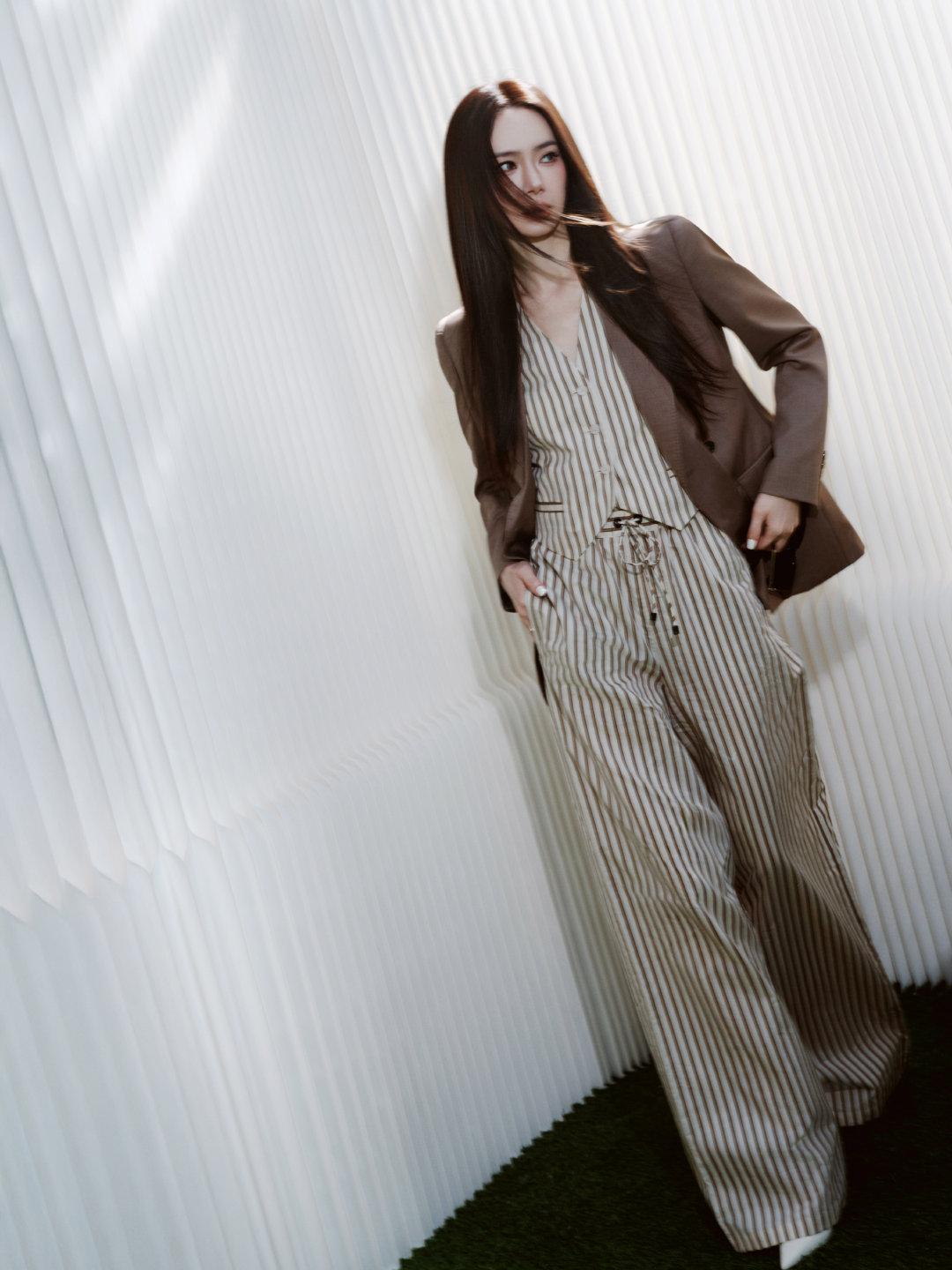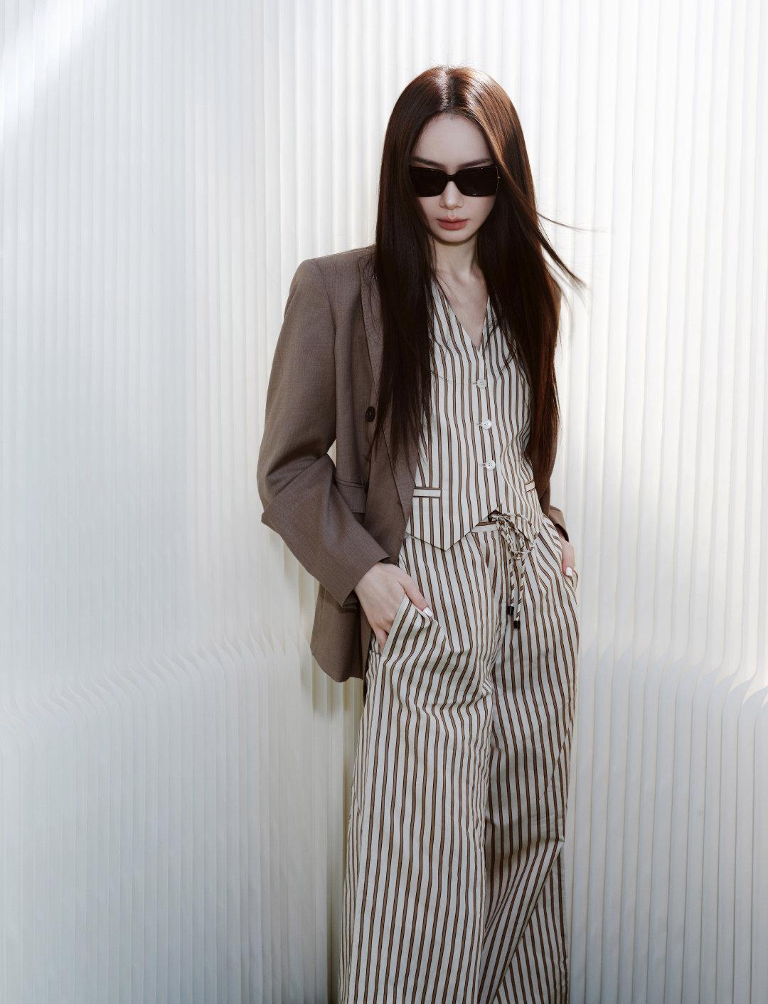 戚薇春季穿搭 西装配条纹套装 懂得的人说 戚薇这一身穿搭 穿出了现代意式美学 从