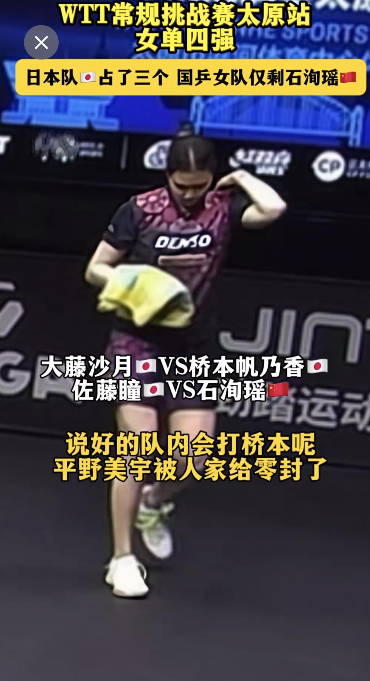 女单四强日本队占了三个 国乒女队仅剩石洵瑶,下一轮对阵,18:10 T1 大藤沙月🇯🇵VS桥本帆乃香🇯🇵,17:00 T1 佐藤瞳🇯🇵VS石洵瑶🇨🇳