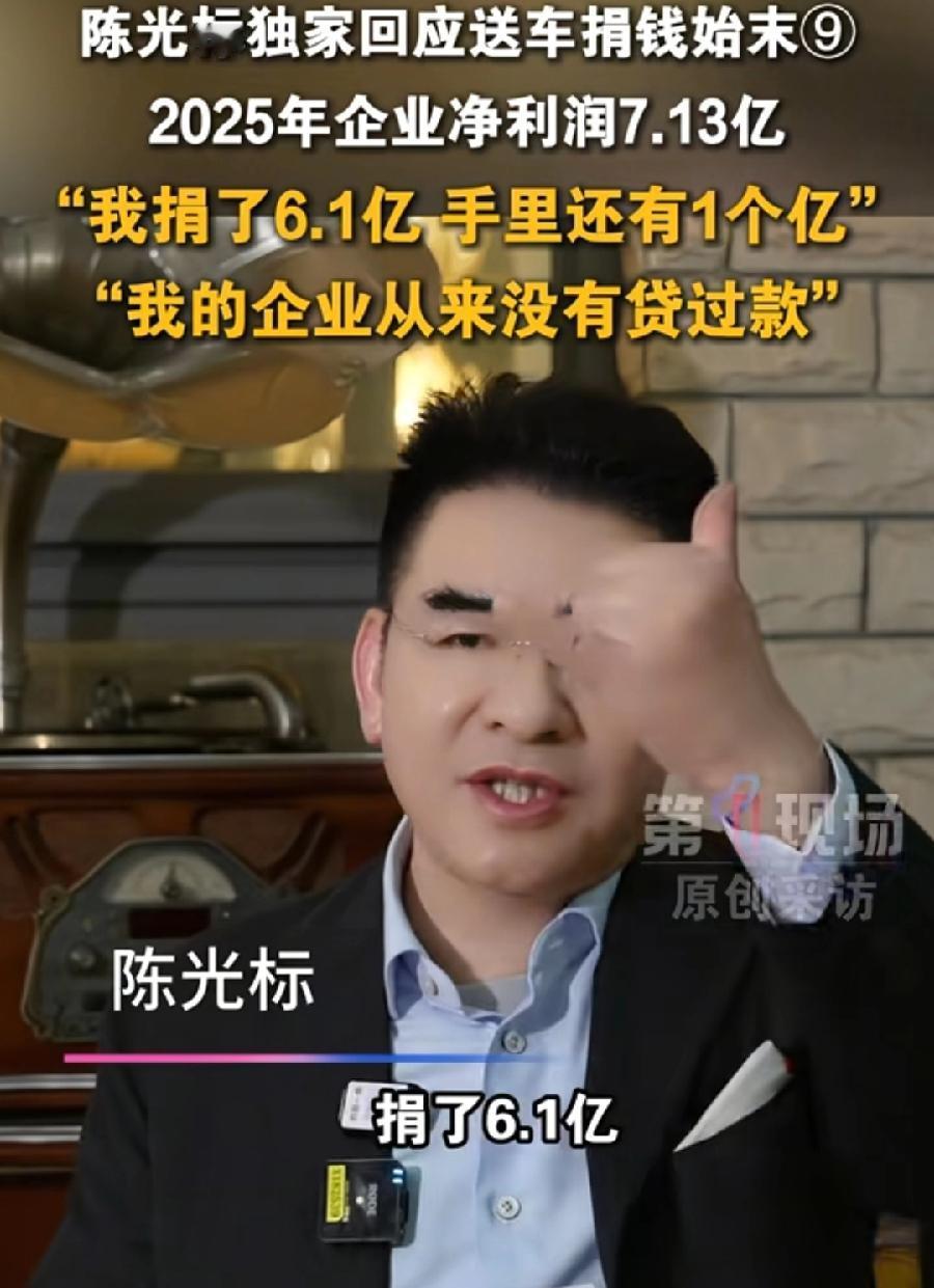 陈光标干的生意真赚钱,自己亲口说,去年赚了7.13亿!捐了6.1亿!一个月平均捐5000万!可见最近捐嫣然1000万,旁人觉得巨额了,其实是标哥很正常的捐赠,陈光标说还剩1个亿,也打算捐掉,这觉悟,企业全部回馈社会,人民企业家,慈善家大善人!好奇搜了一下,陈光标现在干再生资源回收利用生意,这行业类似于能源行业,拿到原材料就是宝,陈光标有生意头脑!
