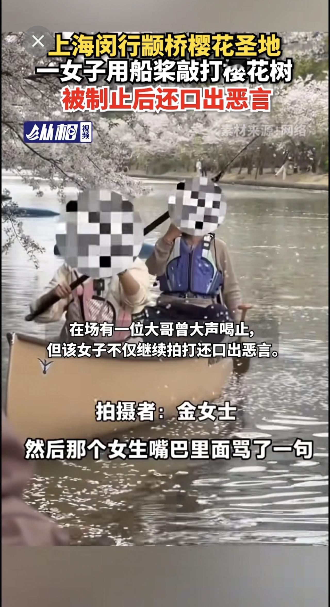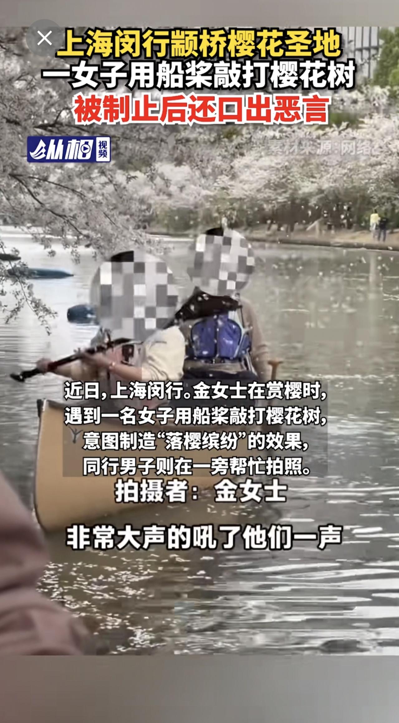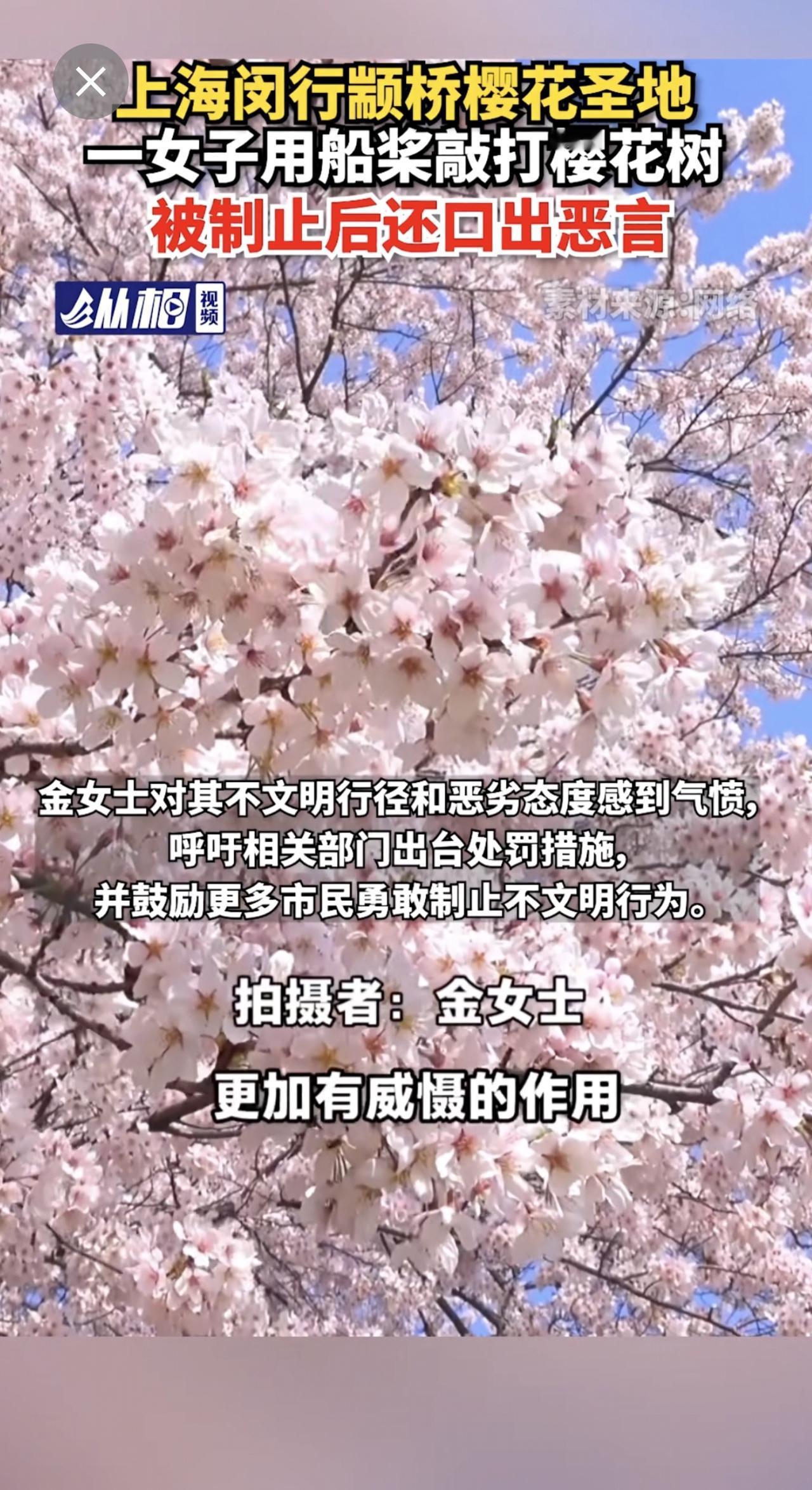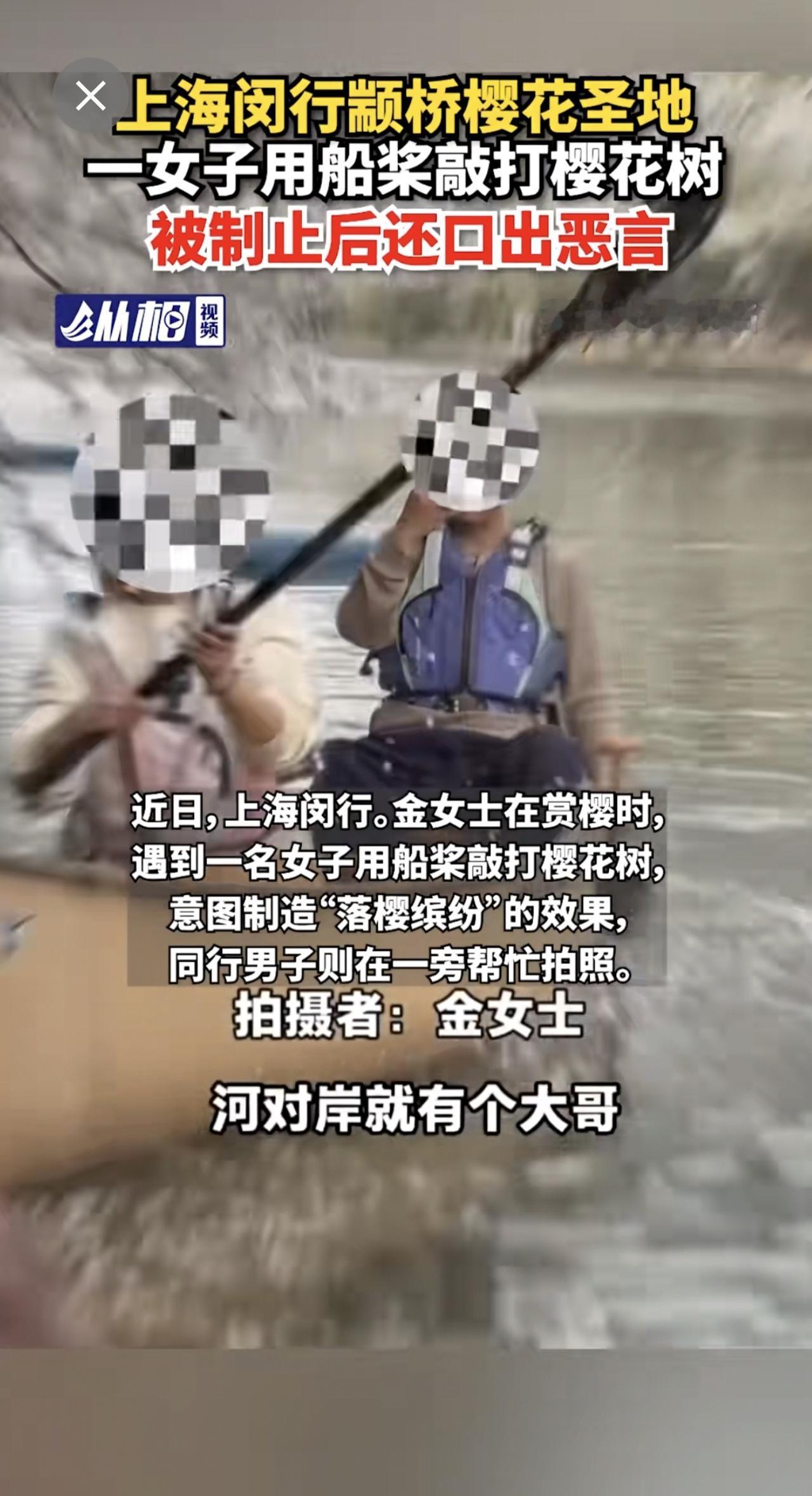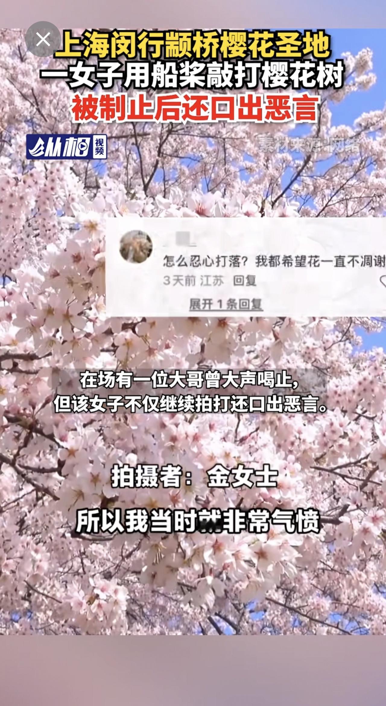 【上海闵行颛桥樱花圣地,一女子用船桨敲打樱花树,被制止后还口出恶言】