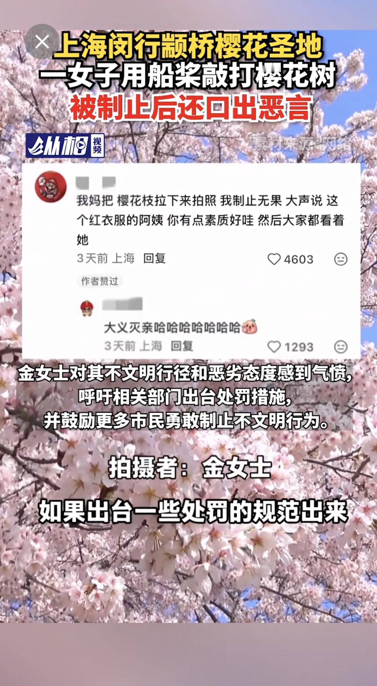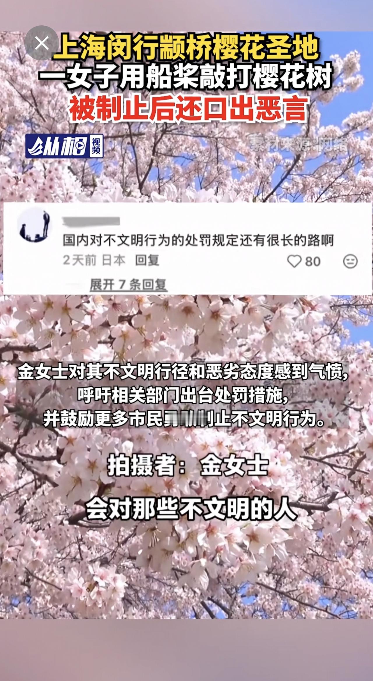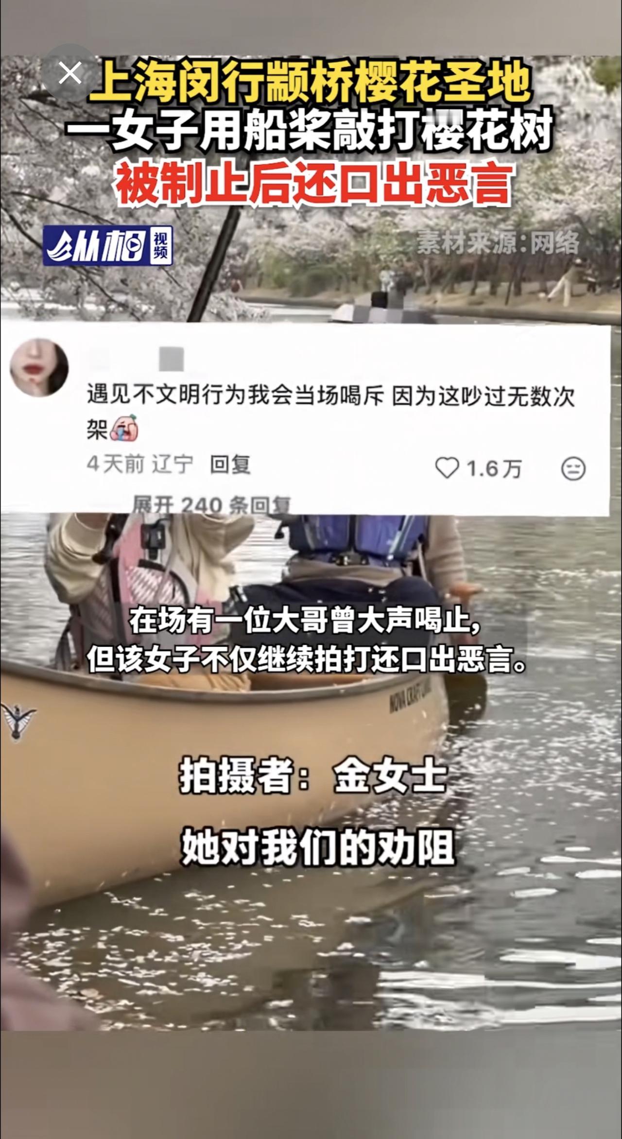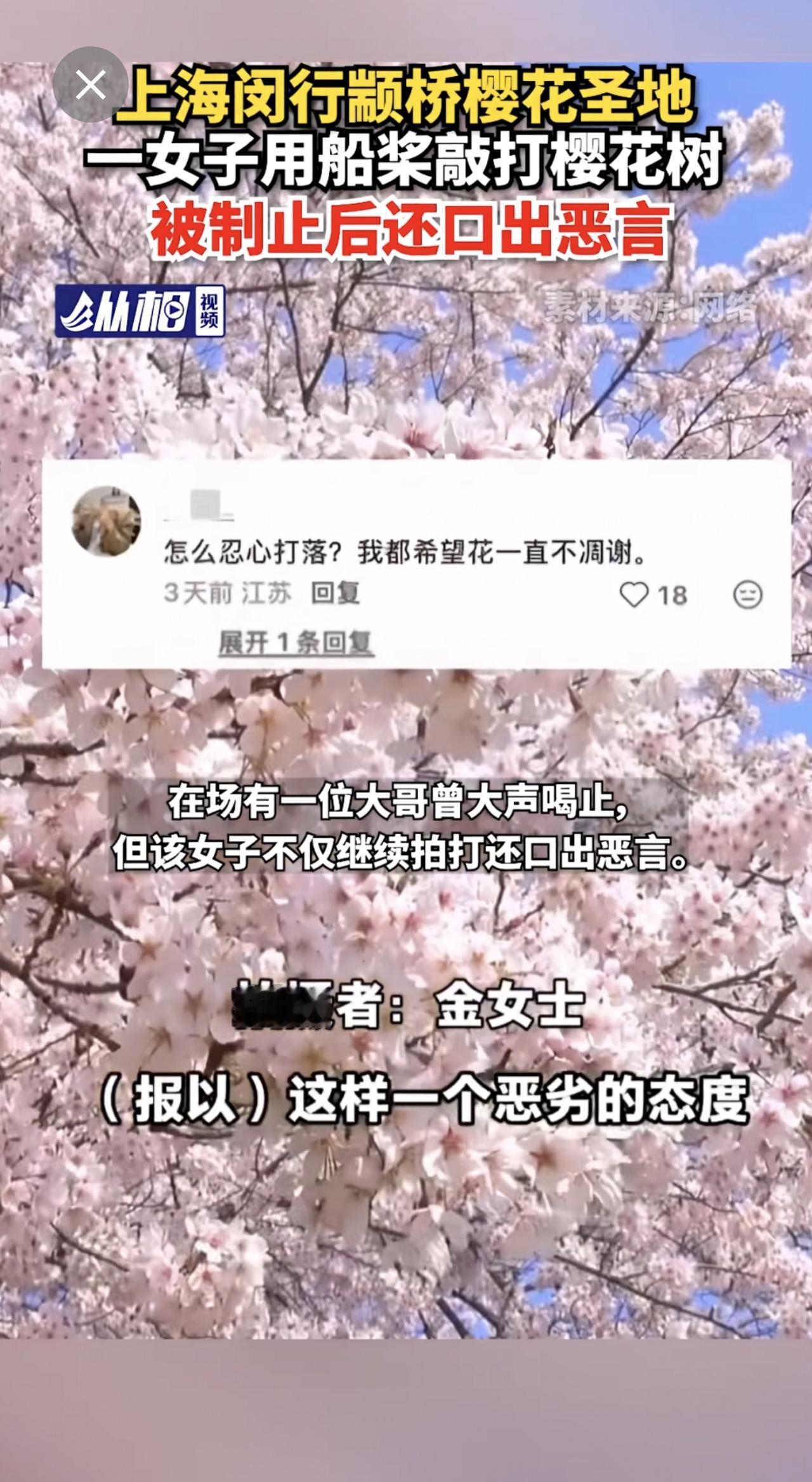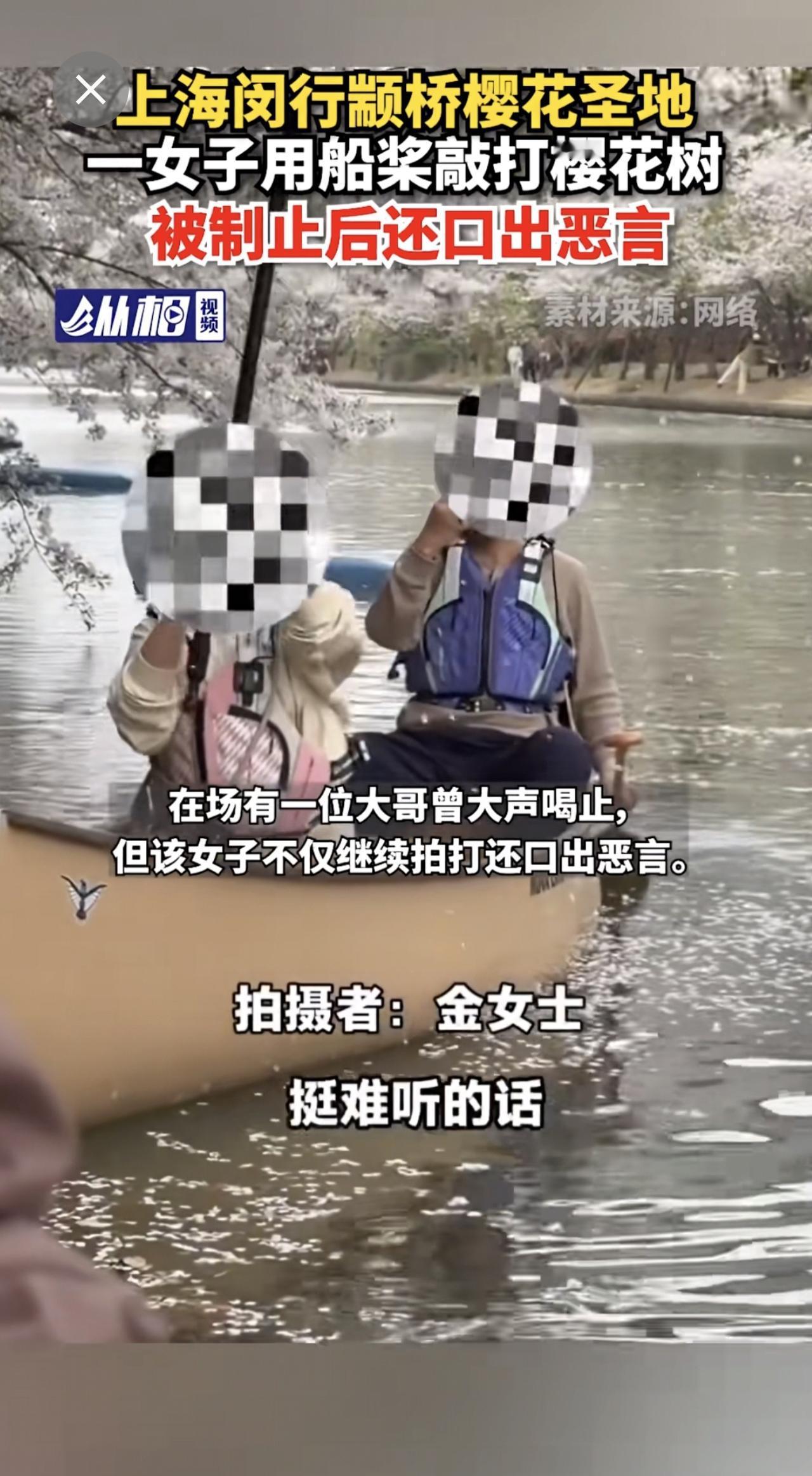 【上海闵行颛桥樱花圣地,一女子用船桨敲打樱花树,被制止后还口出恶言】