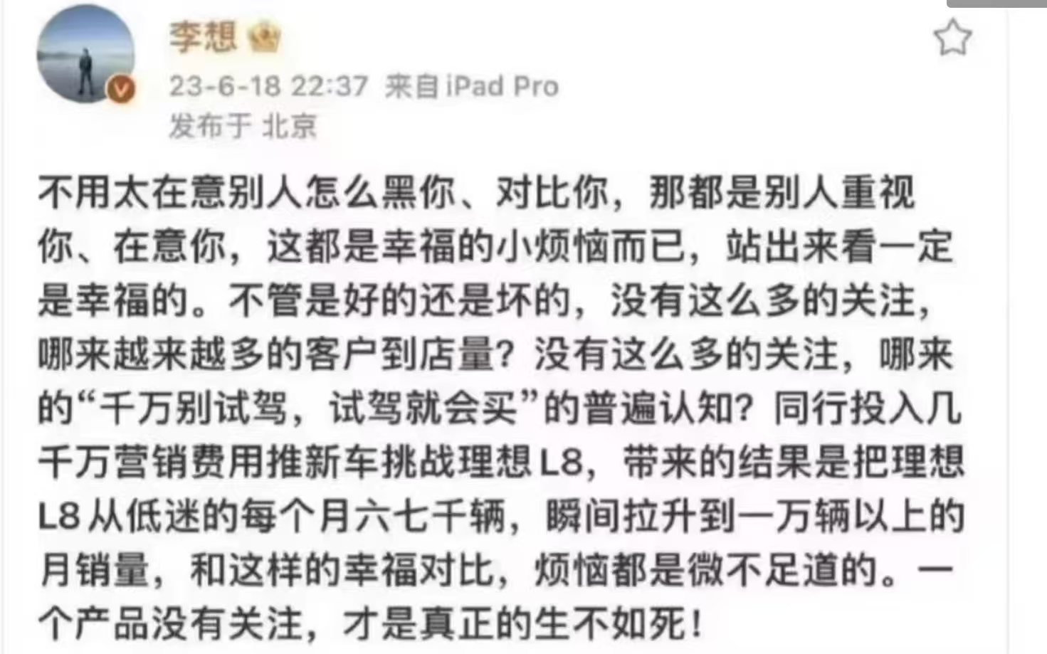 李想朋友圈飙脏话1️⃣双赢,两个车流量都被带飞,订单转化提升2️⃣双输,吃到了流量的反噬3️⃣单输,输的品牌舆论阵地短期内重挫,品牌影响力受损,不得不花费巨额成本修复会是哪种结局呢?