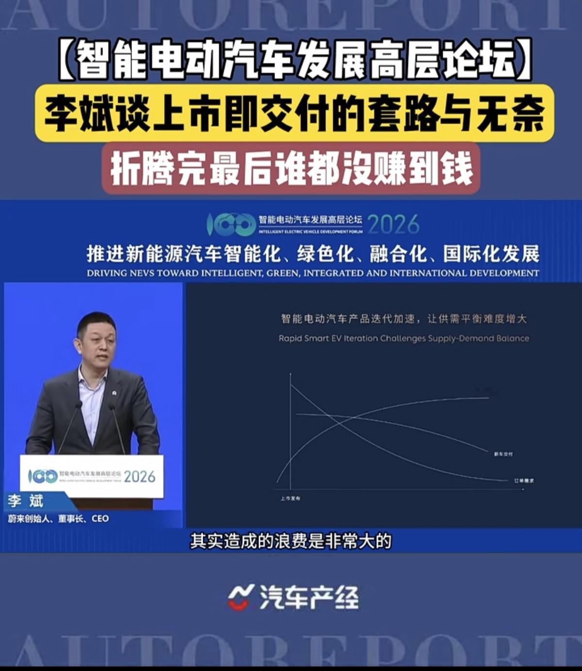 在2026年的智能电动汽车发展高层论坛,李斌谈上市即交付的套路与无奈,折腾完最后谁都没赚到钱!