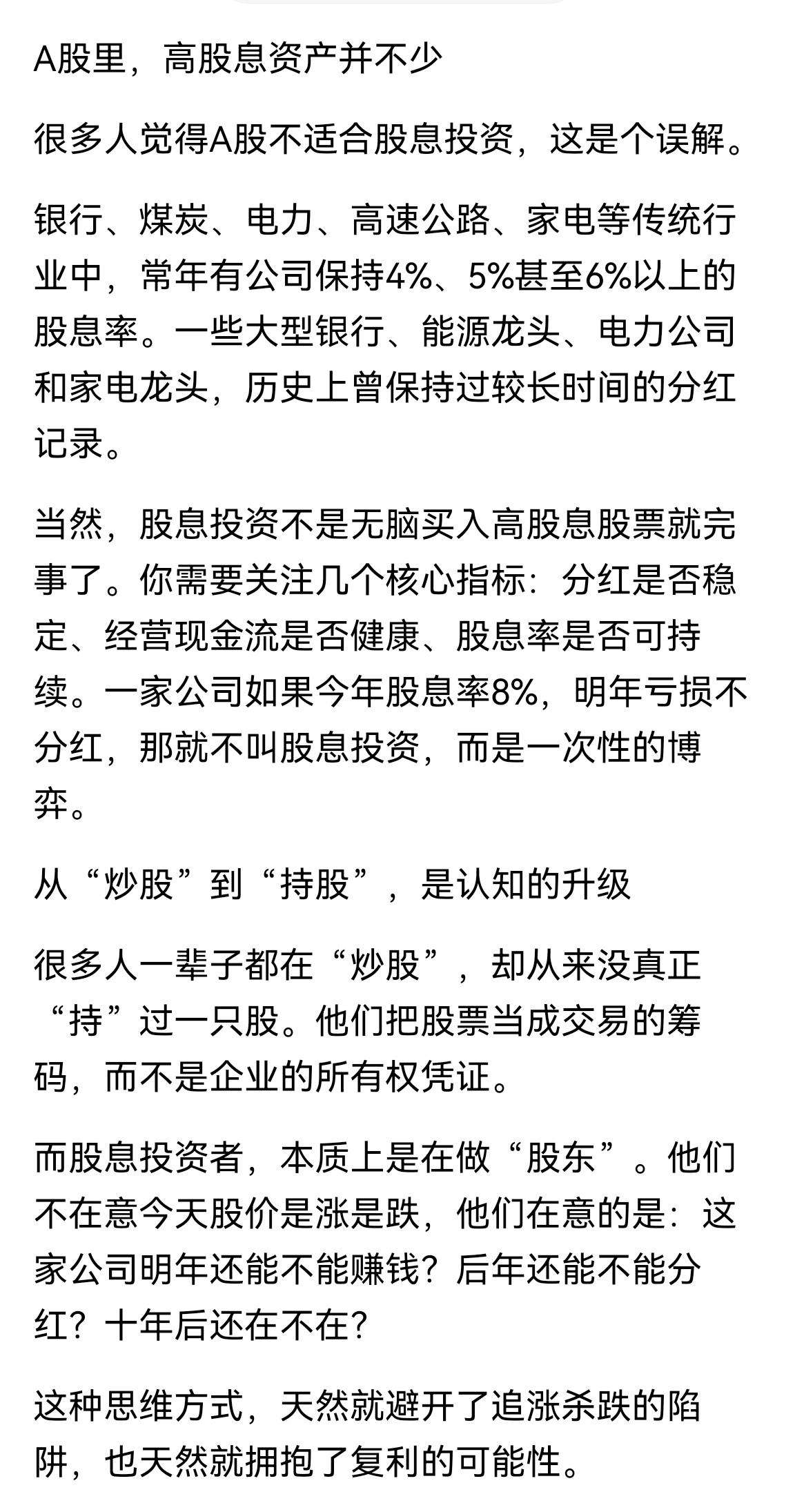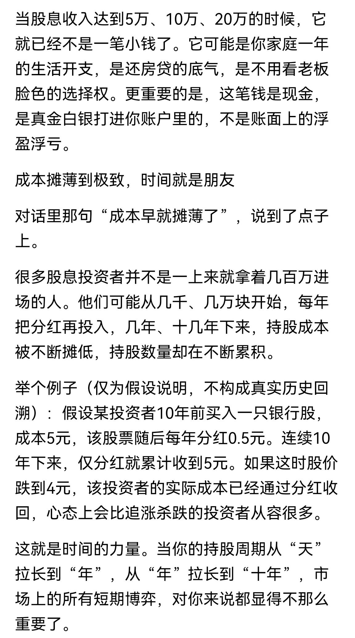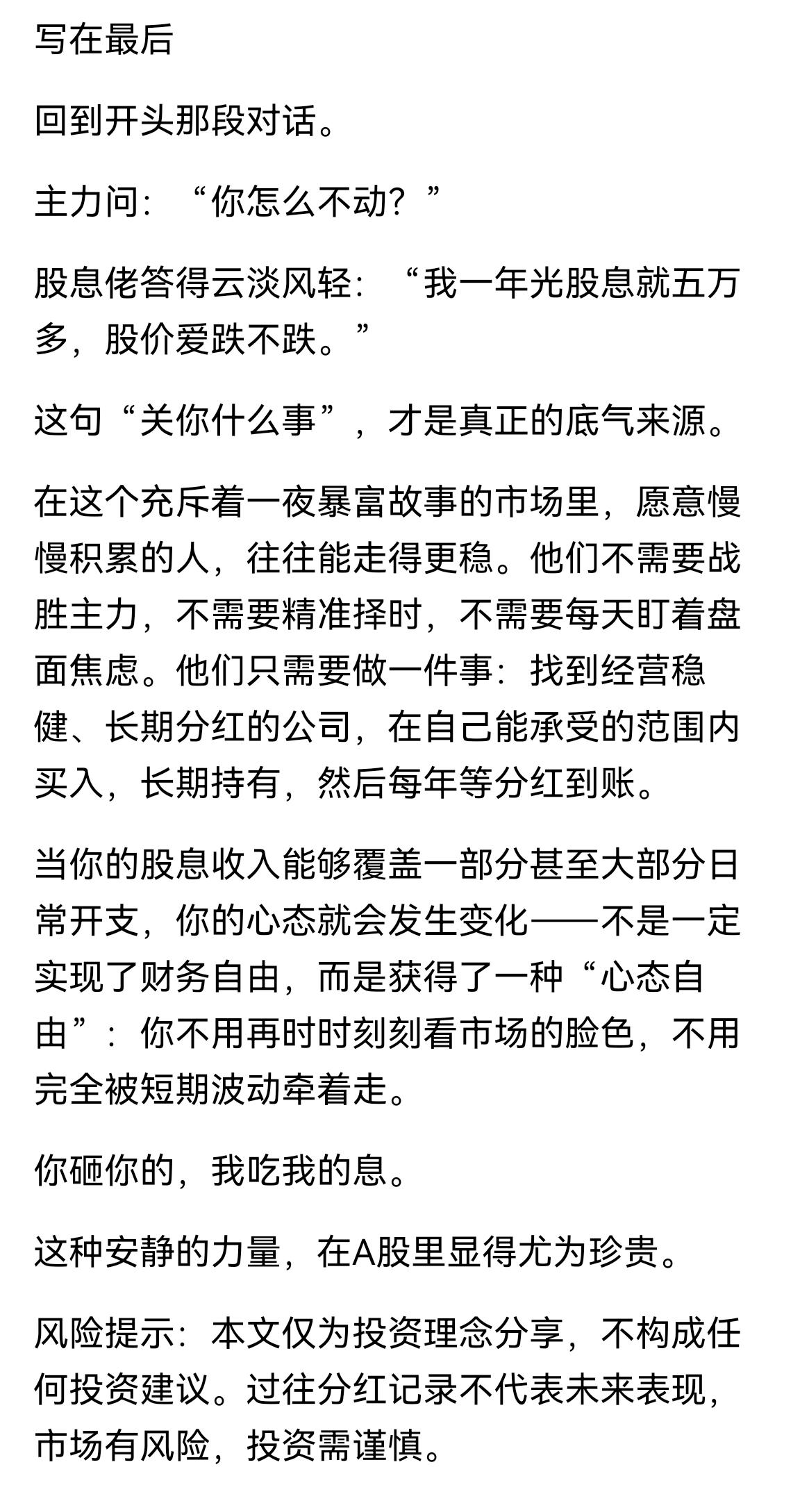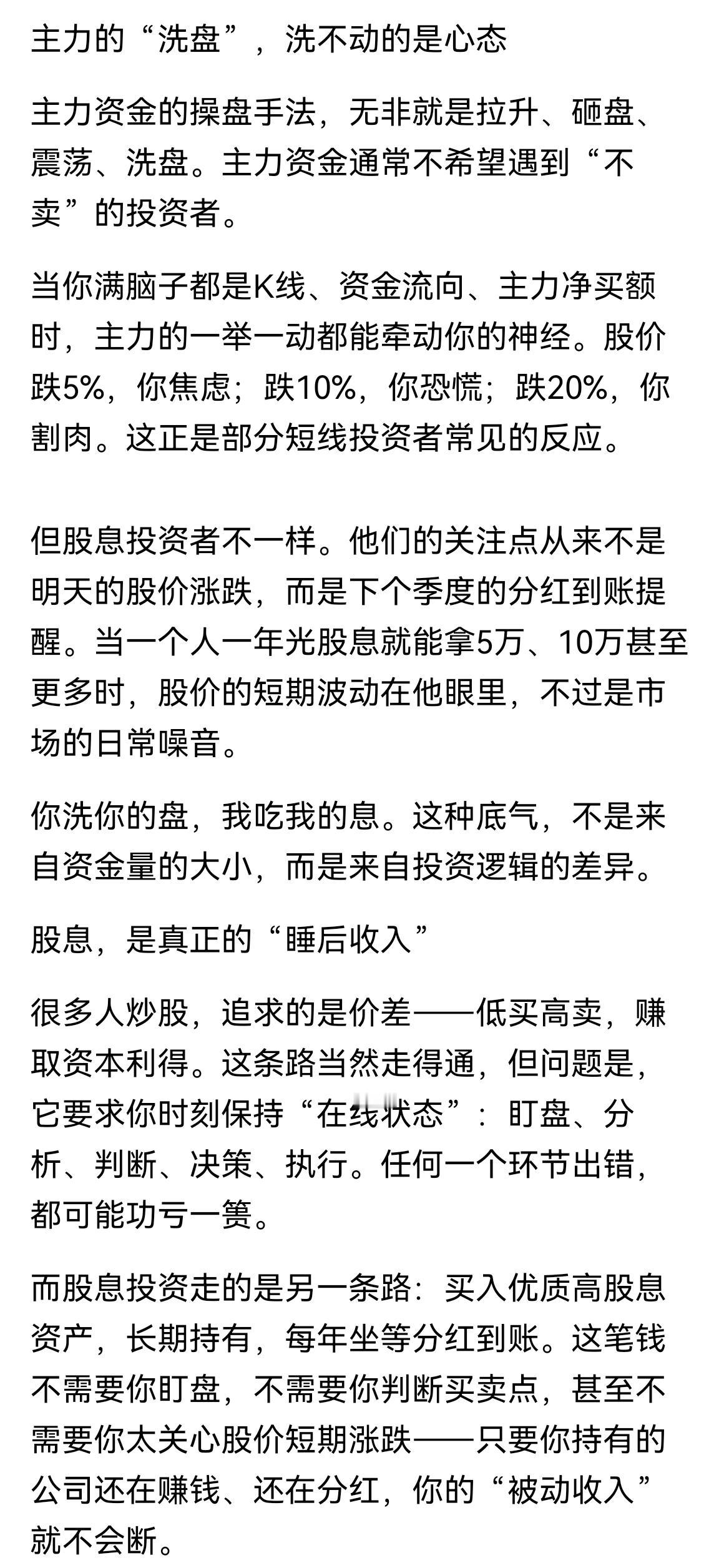持股收息该如何应对股价波动?股价波动无非是筑底—上升—回落—再筑底,A股真的是“A”字形,平底尖顶,一次次循环往复。按作者的说法是,“主力的‘洗盘’,洗不动的是心态,主力资金的操盘手法,无非就是拉升、砸盘、震荡、洗盘”——我过去投机时期真的考虑主力洗盘拉升,现在不关注主力行为,因为值得投资并长期投资的股票往往主力不敢介入——比如一些显而易见的大盘股是价投驻扎地,如果主力敢拉起来到超高估值时就会被价投砸死。股息投资者关注的不是股价涨跌,而是分红的可持续性。现实的股市众人追求的是价差——低买高卖,赚取股票差价,确实有很多人保持“在线状态”:盯盘、分析、判断、决策、执行。回想一下,我投机操作时也不太盯盘,但是也比较辛苦——每天需要对关注股票复盘、每周需要筛查选择股票发现机会,并做出下周操作计划。股息投资相对轻松,买入优质高股息资产长期持有,每年坐等分红到账。只要持有的公司还在稳定经营并赚钱、还在分红,“被动收入”就会持续。要说的一点是,我不追求高股息率但是要求股票必须每年分红,更不追求高分红率而且分红率超过50%的股票并不想持有,或者说我更关注ROE。当然经过长时间积累,股息收入能够覆盖大部分日常开支而获得了一种“心态自由”,不被股市短期波动牵着走了。心态的养成需要时间,需要实践,经历过才能体会到持股的真谛,比如我提过几次的建行,持有十三年了,依靠分红收回本金,而且算年化收益率也不低,其实还有几只没提过的股票也是长期持有,原因是这类股票较难被市场“炒作”,或者说很难出现股价大于股票价值的机会,因为股价一直没有高估,也就一直持有——在股价没有高估时,回报率满足预期收益率。因为知道或者说自己算出来的预期收益率不错,即使少量高估也不一定卖出,比如农行与行业内个股比较估值不低,也没有想着换一换股票,其实是为了让自己心态稳,人的贪心很容易因为小利而漏出苗头。当然,也留出少量仓位做波段,比如证券ETF等,这个不是投资,仅仅是娱乐,因为操作没亏过(不是没套过,只是套住了就忍着),也就长期玩一玩。玩股票,往往是年轻时积累财富为年长时消费备用,谋划长远一些。借着阅读的文章,摘录一些、写了一点,主要是需要散户朋友能体会投资的方式之一,多一些选择。