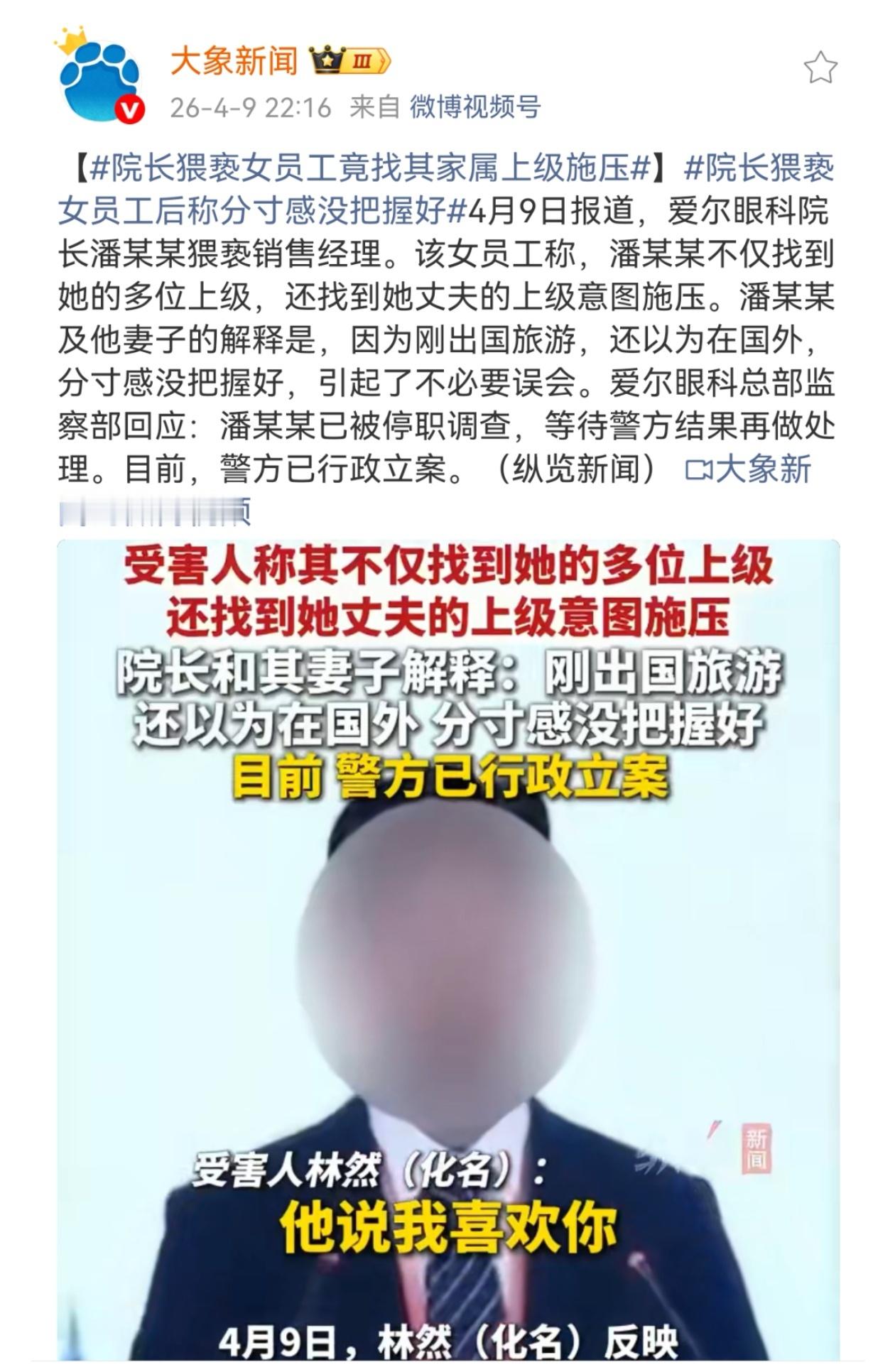 近日,杭州爱尔眼科医院院长潘某某,被指猥亵医药公司销售经理,据爱尔眼科总部监察部回应,潘某某已被停职,警方已立案。离谱的是,涉事院长潘某某及其妻子给出“刚出国旅游,以为在国外,没把握好分寸”的解释,简直刷新公众认知。爱尔眼科医院院长被指猥亵销售经理时事满谈
