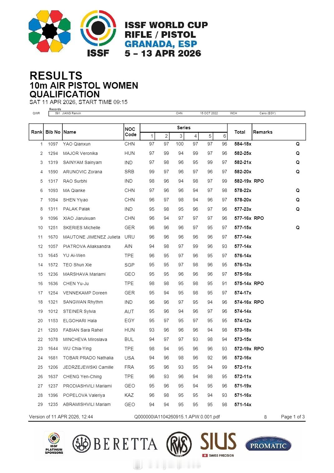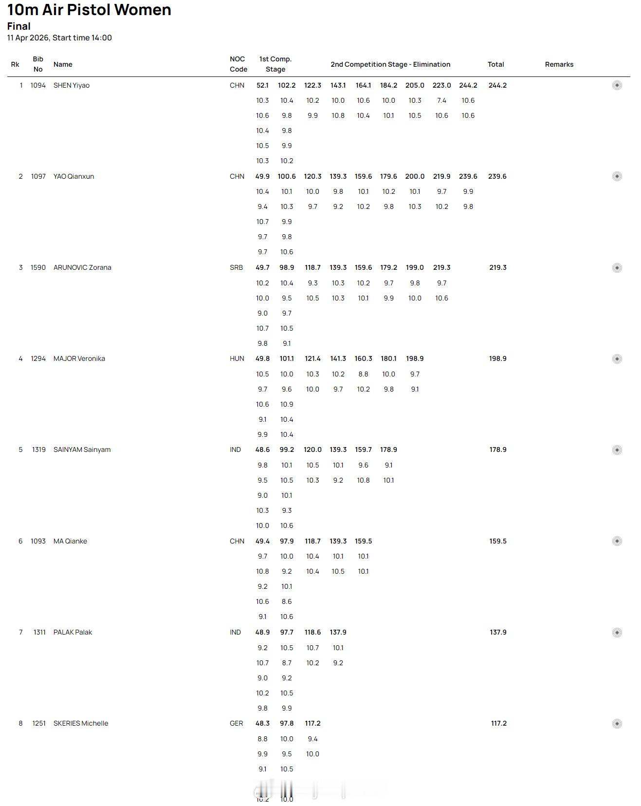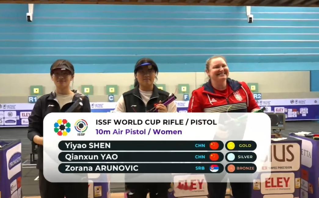 【射击世界杯沈奕瑶断层优势夺冠 姚千寻摘银马千珂第六】国际体坛战报速递 4月11日西班牙格拉纳达,射击世界杯(步手枪)西班牙站结束女子10米气手枪比赛,中国选手包揽冠亚军。首次参加世界杯的21岁沈奕瑶在决赛中一路遥遥领先,尽管在倒数第四枪打出了7.4低环,仍以领先第二名4.6环的巨大优势夺冠,成绩为244.2环。去年世锦赛冠军姚千寻和塞尔维亚名将阿鲁诺维奇分获银铜牌。另外一位中国选手马千珂名列第六。