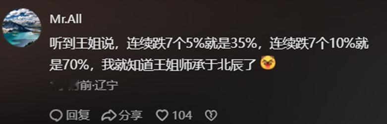 网友纷纷戏称:“听到王姐说连续跌7个5%就是35%,连续跌7个10%就是70%,我就知道王姐师承于北辰了。”“这让我想起台湾那个名人,一发拦截弹成功率70%,三发就是210%”。