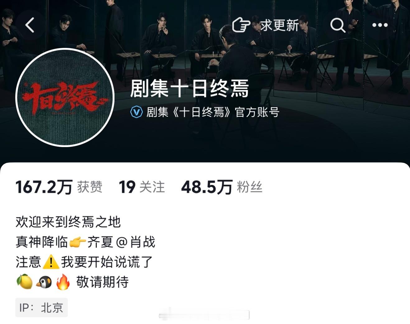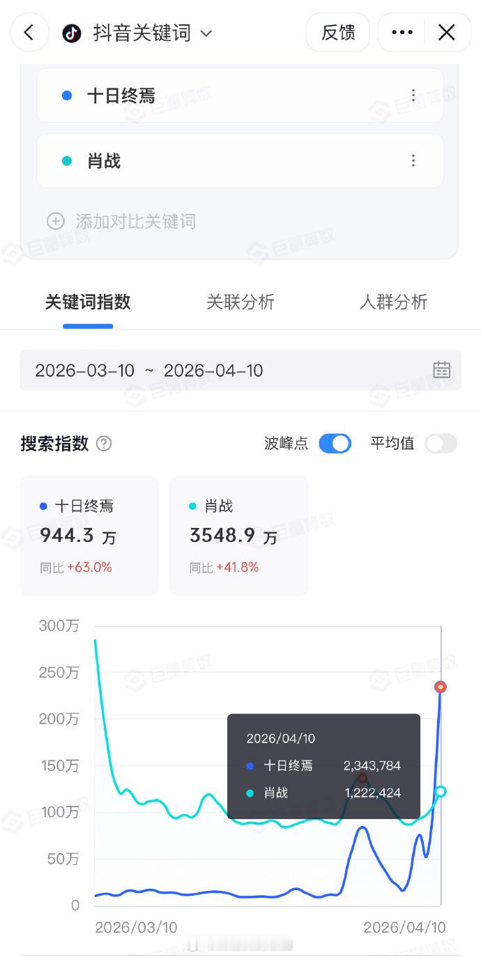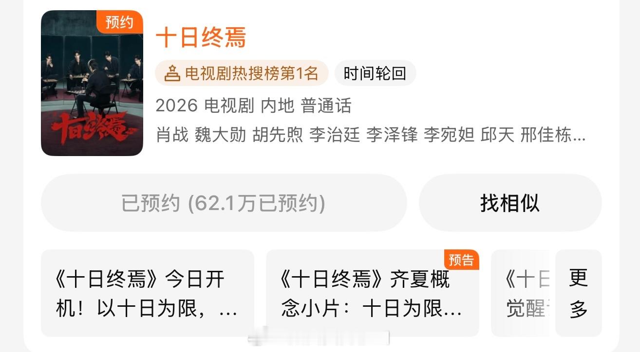 太夸张了太夸张了!第一次看到刚开机的剧热度就直接夯到爆啊!十日终焉官宣开机日数据:微博指数破亿(首部蓄水期破亿的电视剧)抖指234万,肖战122w百指2.2w,肖战4.6w微指3900w+,肖战5700w+目前腾讯预约量62.1万,官博粉丝量51.8万,官抖粉丝量48.5万 !!!肖战十日终焉登剧集榜TOP1十日终焉微博指数破亿肖战十日终焉热度 肖战十日终焉同款组服卖断货