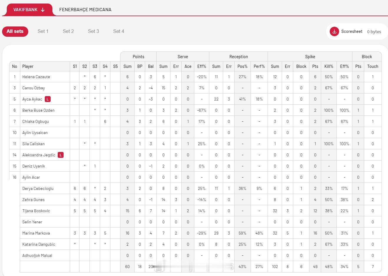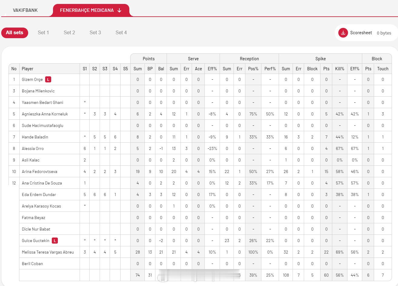 【土超女排决赛II瓦基弗1-3费内技术统计 巴尔加斯28分】4月11日伊斯坦布尔,土超女排决赛第二回合,瓦基弗银行主场1-3(25-19/18-25/18-25/20-25)不敌费内巴切。马尔科娃16分、博斯科维奇15分,巴尔加斯28分、费多罗夫采娃19分。