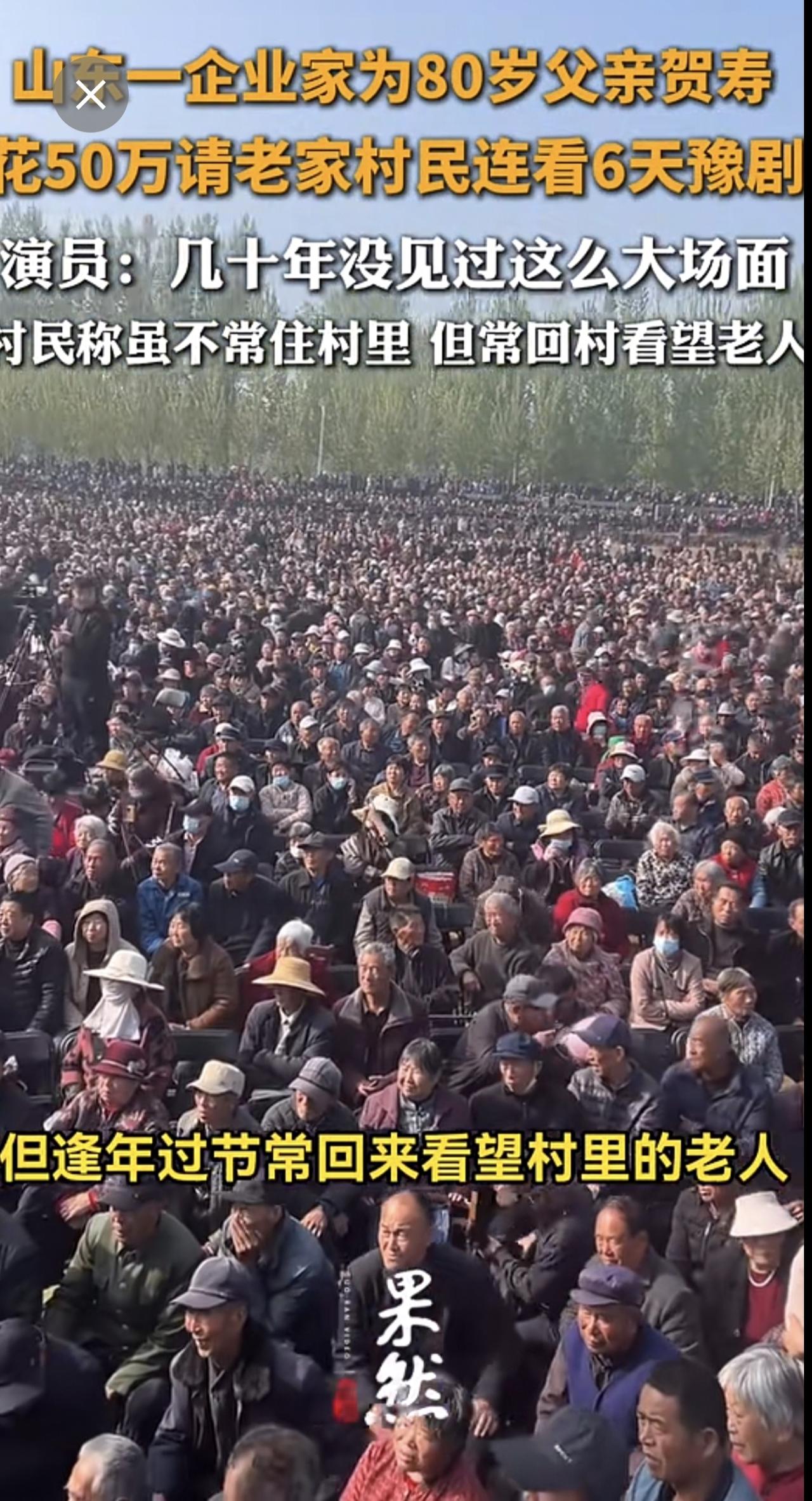 山东一企业家为80岁父亲贺寿,花50万请老家村民连看6天豫剧,演员:几十年没见过