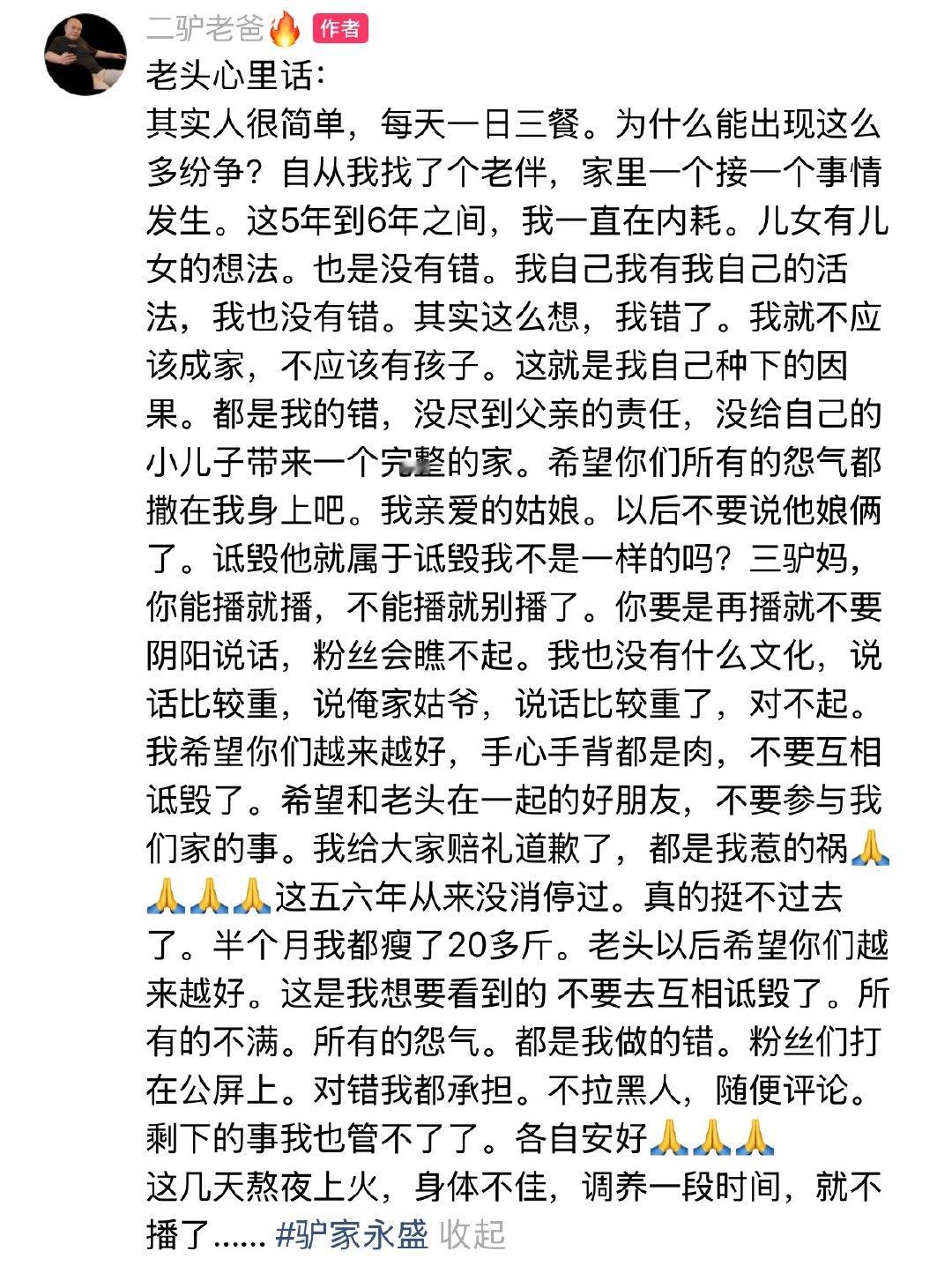 其实人很简单,每天一日三餐。为什么能出现这么多纷争?自从我找了个老伴,家里一个接一个事情发生。这5年到6年之间,我一直在内耗。儿女有儿女的想法。也是没有错。我自己我有我自己的活法,我也没有错。其实这么想,我错了。我就不应该成家,不应该有孩子。这就是我自己种下的因果。都是我的错,没尽到父亲的责任,没给自己的小儿子带来一个完整的家。希望你们所有的怨气都撒在我身上吧。我亲爱的姑娘。以后不要说他娘俩了。诋毁他就属于诋毁我不是一样的吗?三驴妈,你能播就播,不能播就别播了。你要是再播就不要阴阳说话,粉丝会瞧不起。我也没有什么文化,说话比较重,说俺家姑爷,说话比较重了,对不起。我希望你们越来越好,手心手背都是肉,不要互相诋毁了。希望和老头在一起的好朋友,不要参与我们家的事。我给大家赔礼道歉了,都是我惹的祸。这五六年从来没消停过。真的挺不过去了。半个月我都瘦了20多斤。老头以后希望你们越来越好。这是我想要看到的 不要去互相诋毁了。所有的不满。所有的怨气。都是我做的错。粉丝们打在公屏上。对错我都承担。不拉黑人,随便评论。剩下的事我也管不了了。各自安好!这几天熬夜上火,身体不佳,调养一段时间,就不播了.....