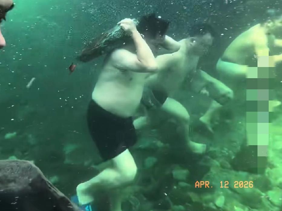 原来,4名男子手里拿着的不是公文包,而是石头,这样可以让他们更好的在水里行走,没仔细看还以为是夹着公文包呢,走在水底还以为要去龙宫谈业务的样子,真是第一次遇见这种事情,天下之大无奇不有,还有人可以在水里憋气行走,如履平地的!