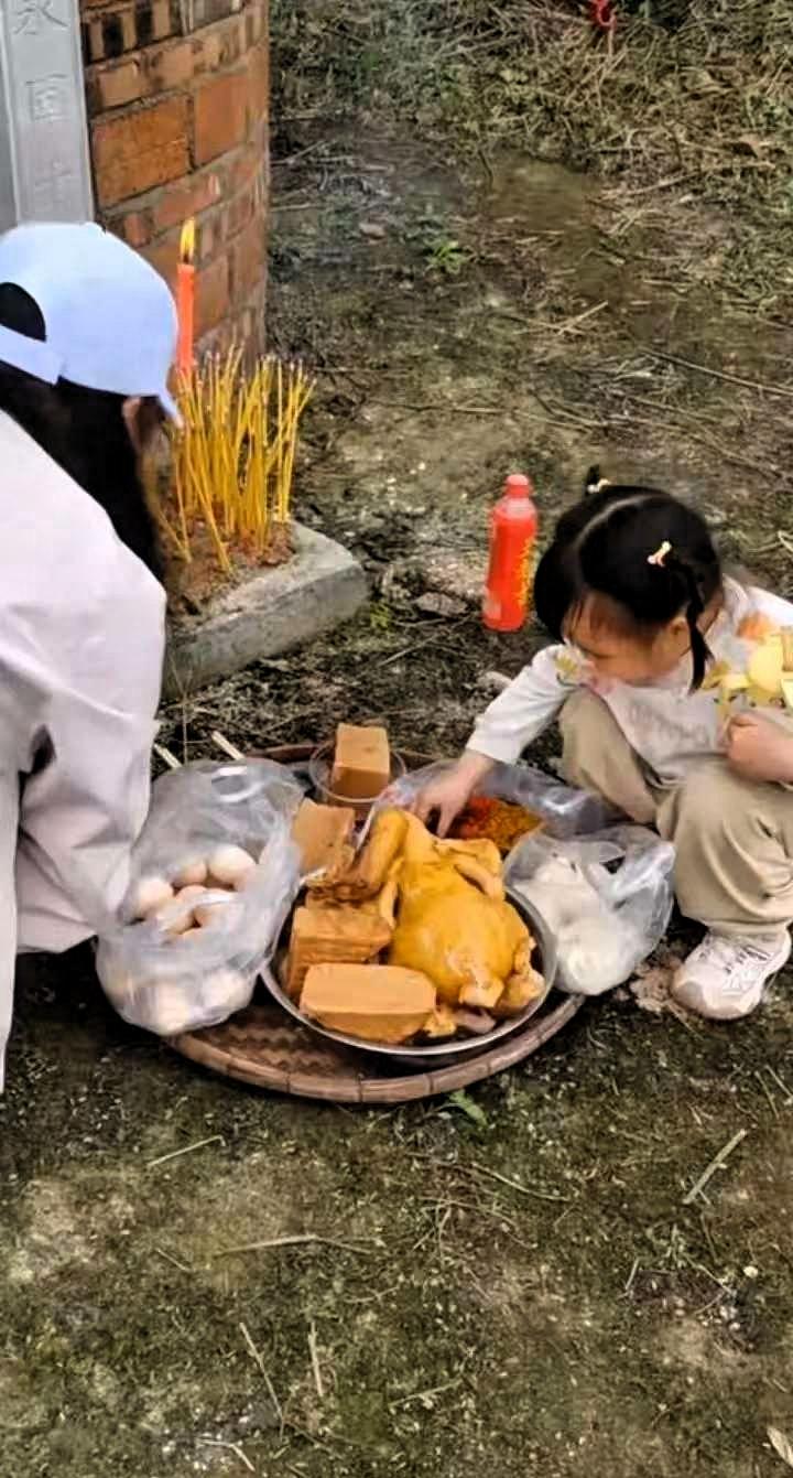 真是让人哭笑不得!广东某地,清明时节,女子带女儿去给老祖宗上坟,摆好祭品、上香行礼之后,一回头发现女儿已经在一旁吃起了祭品。孩子年纪小不懂习俗,只觉得食物诱人,妈妈当场又无奈又担心,还拍了视频问网友,这样会不会对先人不敬。