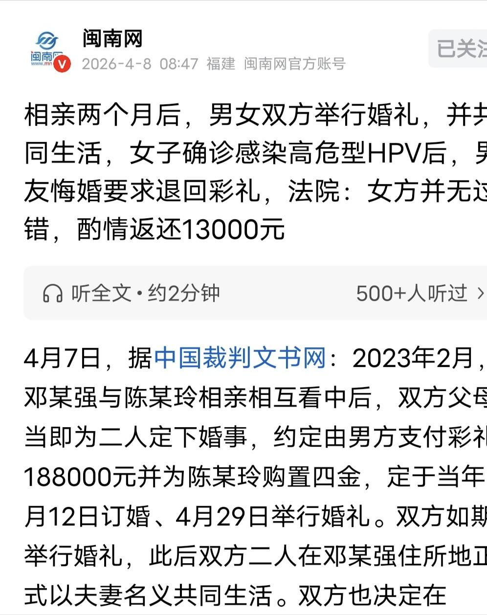 信源:举行婚礼共同生活后,女子确诊感染高危型HPV,丈夫悔婚家暴要求退回彩礼,法院:女方无过错,酌情返还13000元2026-04-09 16:51:25