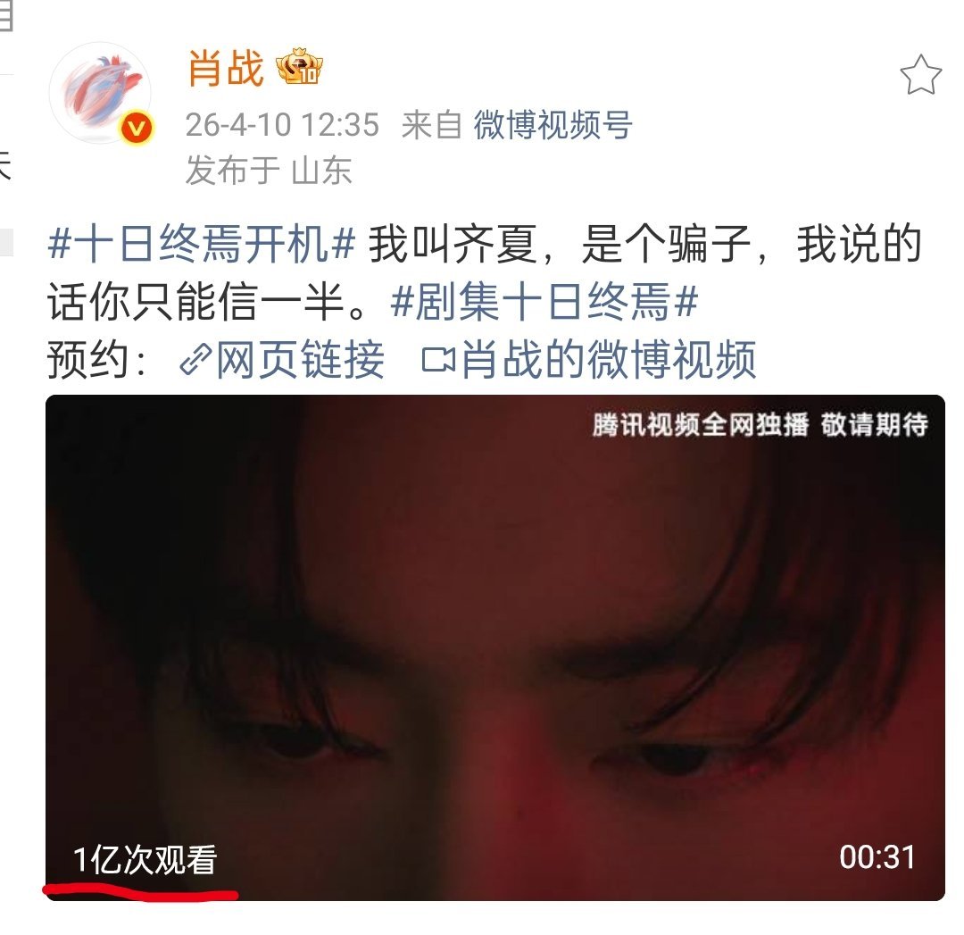 肖战肖战十日终焉微指破亿 首部在蓄水期就微博指数破亿☝🏻官宣不到两天,肖战单人预告播放量破亿🔥,有肖战等于神buff,《十日终焉》开机即炸穿内娱!!! 肖战齐夏