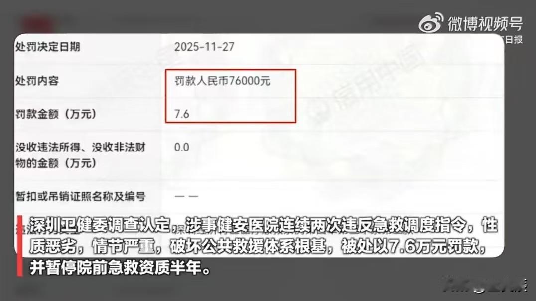 事发后,他们多方寻求帮助,向属地卫健部门投诉。结果是,深圳市卫健委经过三个多月的调查,认定健安医院连续两次违反急救调度指令,性质恶劣,情节严重,破坏公共救援体系根基,于2025年11月27日作出决定,对健安医院处以7.6万元的罚款,并暂停院前急救资质半年。